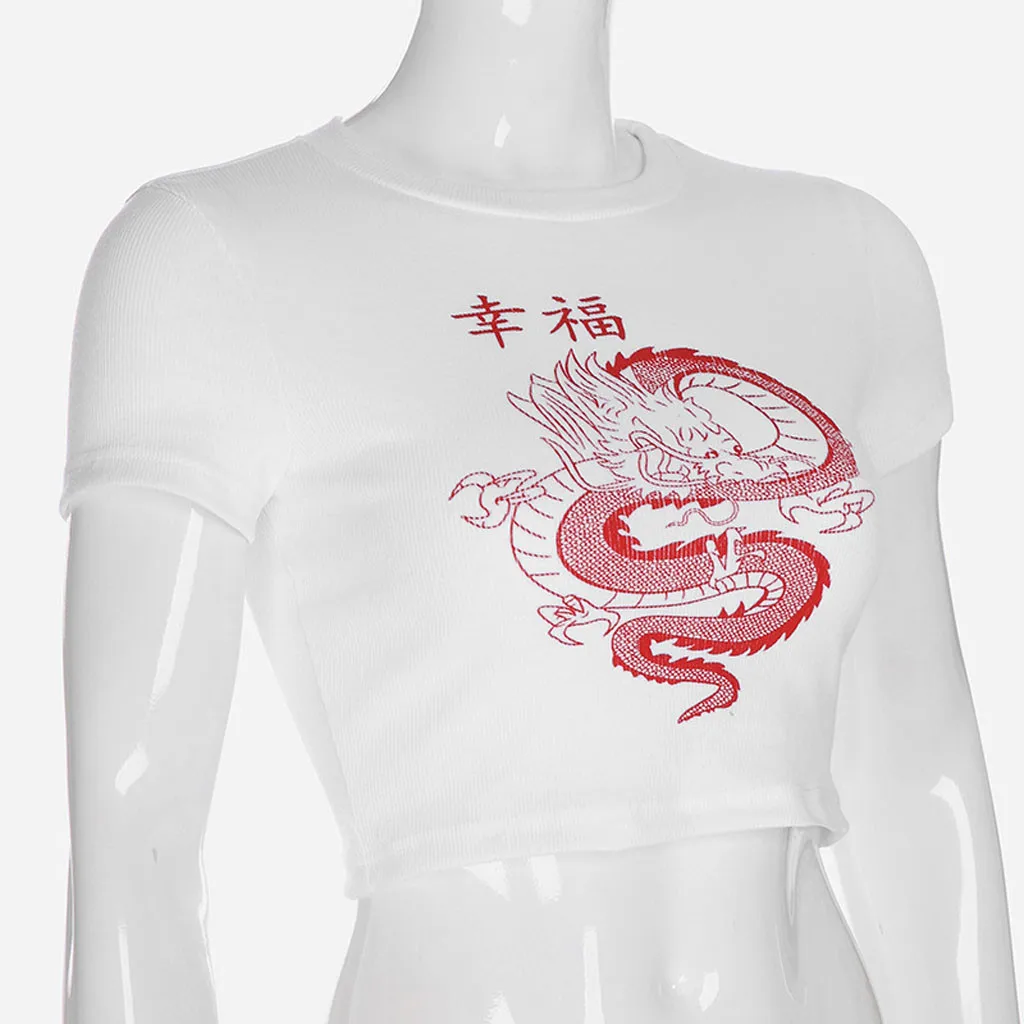 Женский Повседневный Топ Jaycosin, белый топ с короткими рукавами и принтом в виде китайского персонажа дракона, уличная одежда