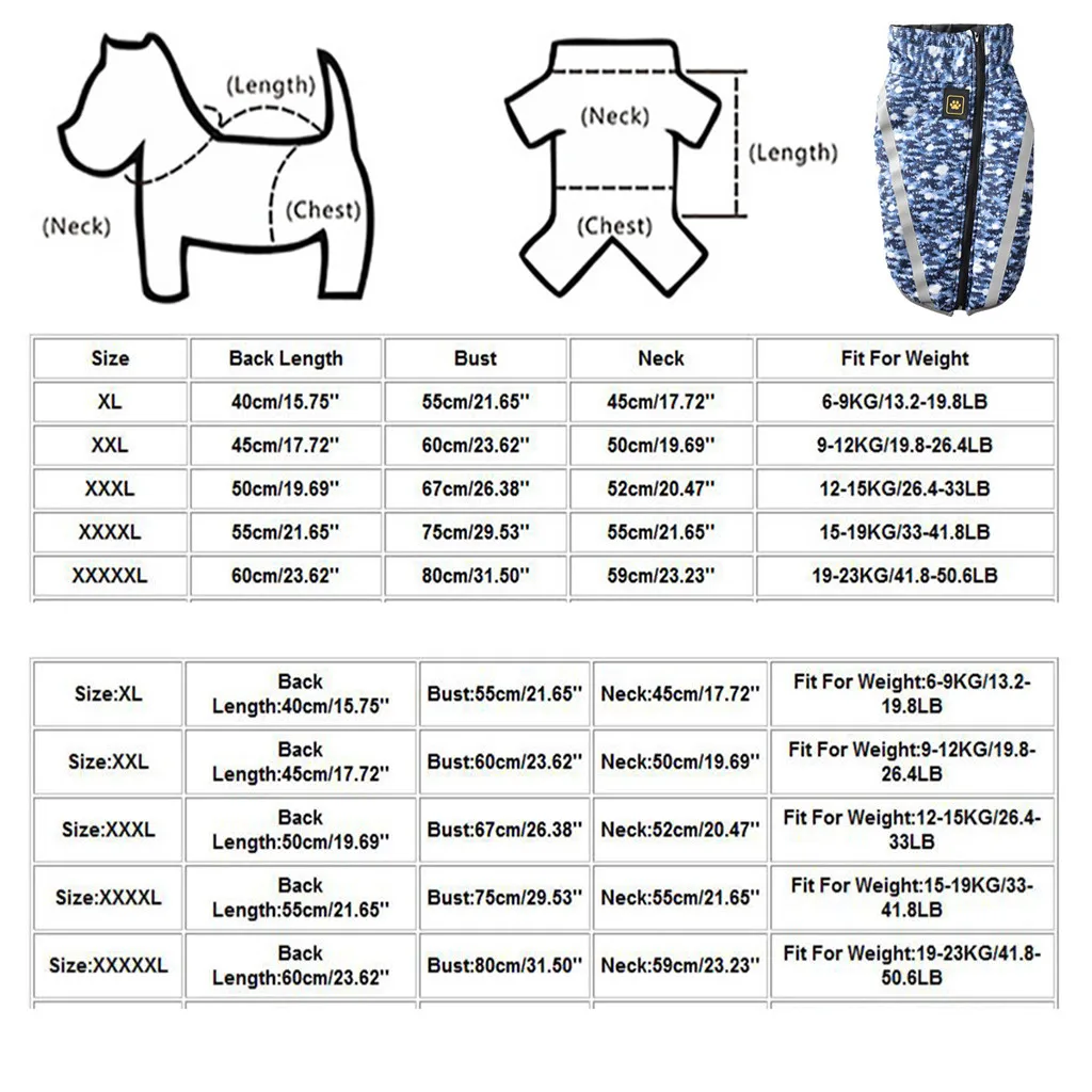 5 размеров-XL, XXL, XXXL,XXXXL,XXXXXL. Пожалуйста, измерьте свою собаку и сравните с нашей таблицей размеров или свяжитесь с нами перед покупкой, чтобы выбрать наиболее подходящий размер.