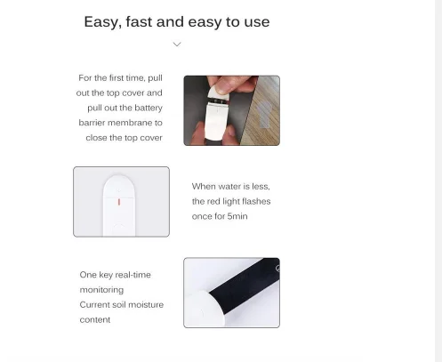 Гигрометр почвы прост в эксплуатации. Одна кнопка, чтобы показать вам состояние влажности почвы на индикаторном светильник. Красный цвет означает отсутствие воды, зеленый-умеренное содержание влаги, синий-богатая вода. Когда вода в грунте немного, гигрометр почвы будет мигать красный светильник каждые 5 минут, Напоминая вам о воде.