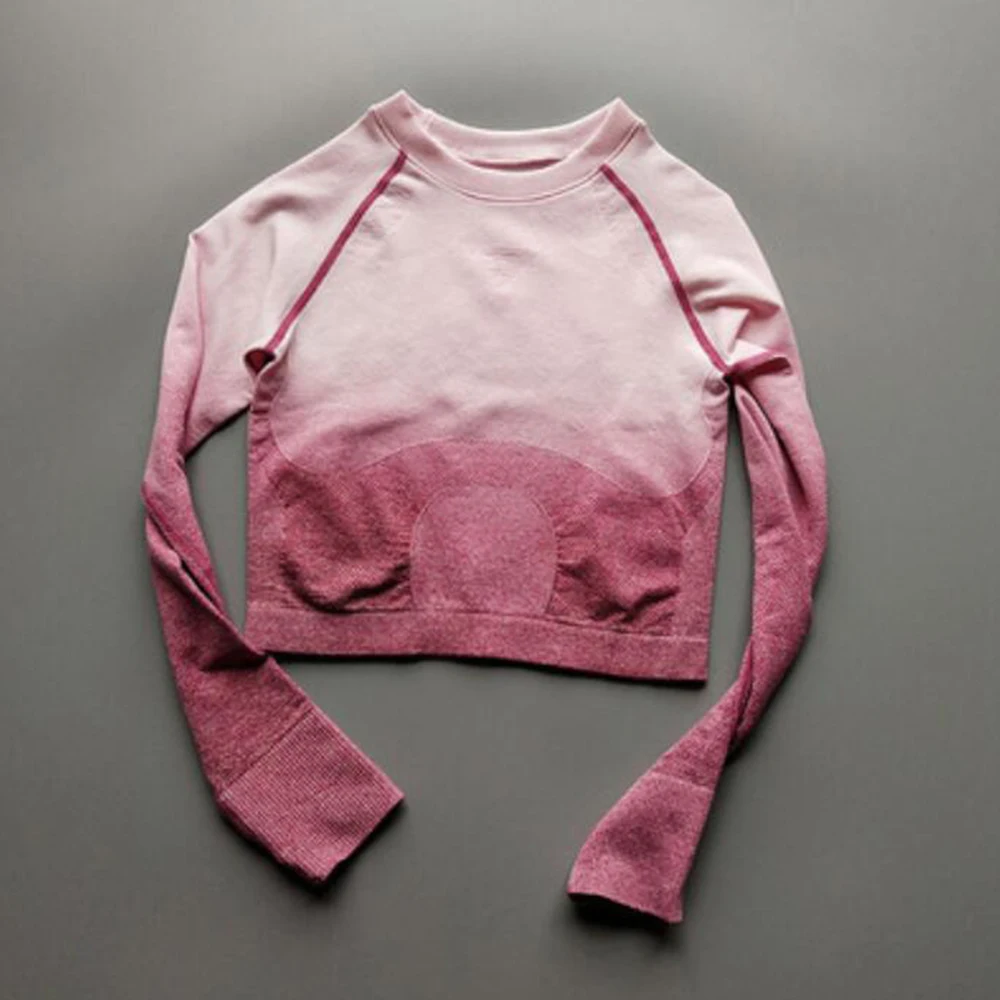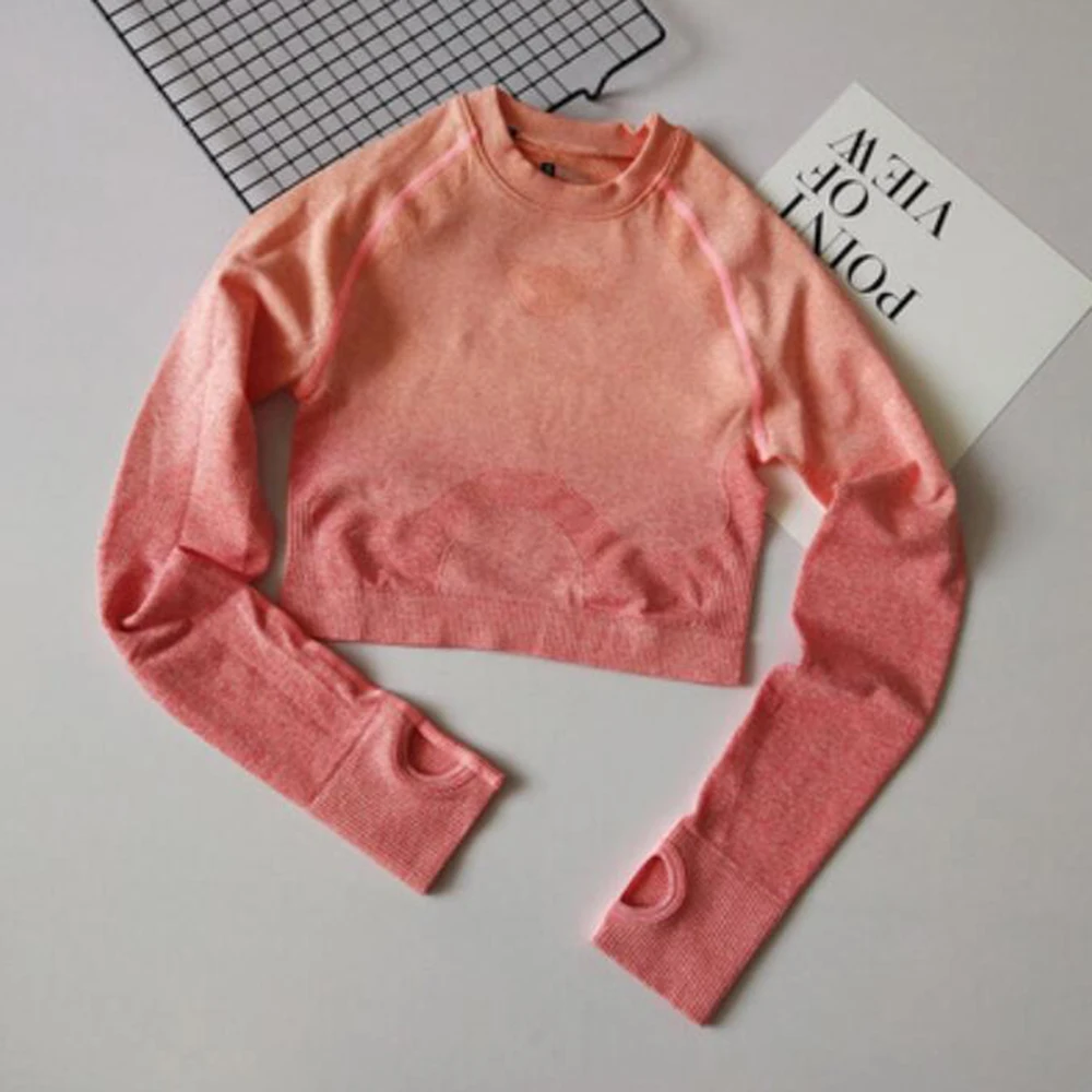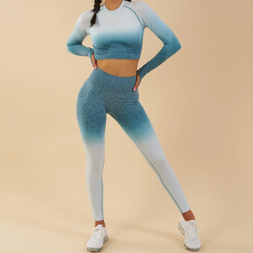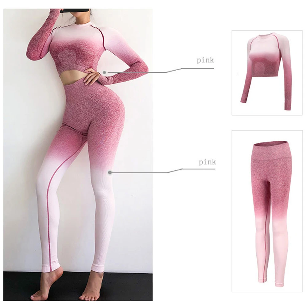 Женский комплект для йоги, одежда для спортзала, Омбре, бесшовные леггинсы с градиентом + Топ с длинным рукавом, спортивный костюм для тренировок, Женский комплект для фитнеса, одежда для активного отдыха, 35