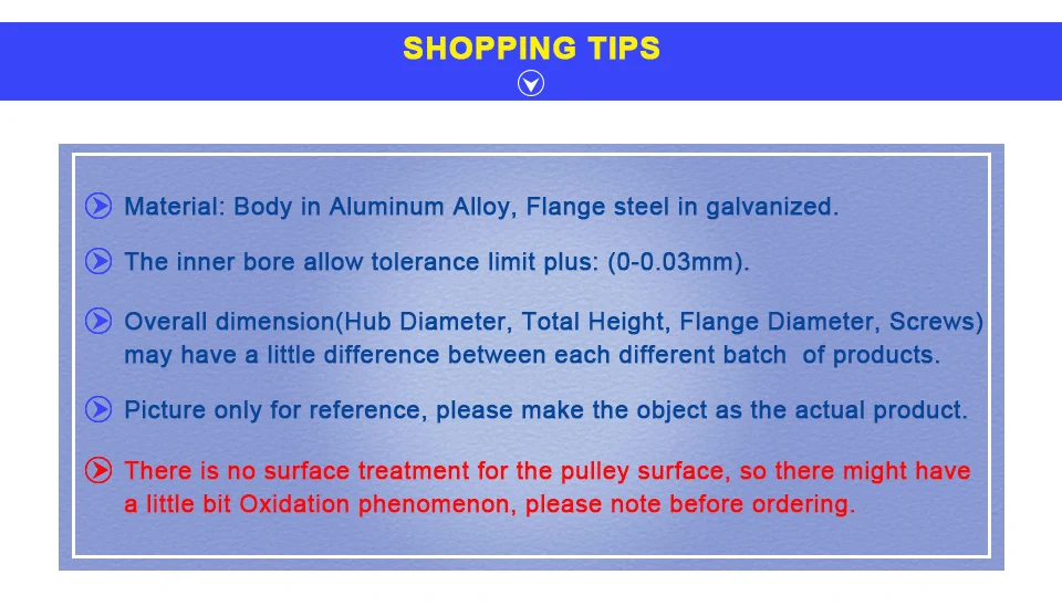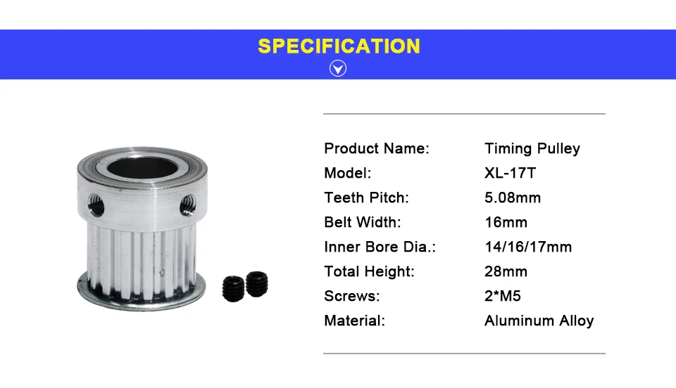Название продукта: шкив ГРМ Модель: XL-17T зубов Ширина ремня: 16 мм Внутренний диаметр отверстия: 14/16/17 мм Шаг зубьев: 5,08 мм Зубы Тип: в форме трапеции Общая высота: 28 мм Винты для каждого комплекта: 2 * M5 Материал: алюминиевый сплав с оцинкованным железом Посылка: 1 шт. XL 17T шкив ГРМ и M5 * 2 (винты)