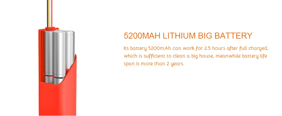 5200 мА/ч, может работать 2,5 часов после полной зарядки, который является достаточным для того чтобы очистить большого дома, жизненный цикл-это больше, чем 2 года.
