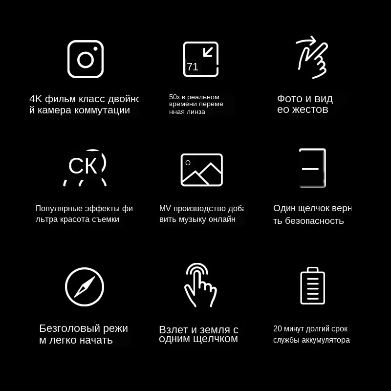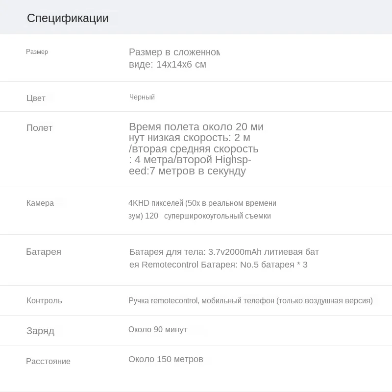 Особенности: 1. Руки складные, небольшие по размеру и легко носить с собой. 2. С функцией удержания высоты обеспечивает стабильный полет. 3. С привлекательным безголовым режимом, полностью решая проблемы "потери ориентировки". 4. камера 4 K HD позволяет запечатлеть ваши блики. двойная конструкция камеры принимается, и угол обзора может быть свободно переключен через пульт дистанционного управления, что дает вам больше творческого пространства. 5. Контроль приложения, 50x зум-объектив, функция фильтра красоты. Легко записывать качественные изображения через жесты. 6. 6-осевой гироскоп сильная стабильность, легко осуществлять различные движения полета, более сильное сопротивление ветра, легче контролировать. Функции: Камера 4 K HD, фиксированная высота давления воздуха, съемка и падение одной кнопкой, фото жестов, управление мобильным телефоном, траектория, передача в реальном времени, рулон 360 °, Безголовый режим, контроль скорости, 50x зум-объектив, функция светофильтра красоты, MV музыкальное видео производство, восходящий и нисходящий, левый поворот направо, вперед, назад. Технические характеристики: Номер товара: KK6 Цвет: черный Емкость аккумулятора: 3,7 в 2000 мАч Размер расширения продукта: 14*14*6 см (в сложенном виде), 27*26*6 см (в разложенном виде) Батарея дистанционного управления: 3 * AA батареи (не включены) Время зарядки: около 60-90 минут Время полета: около 20 минут Дальность полета: в пределах 100 метров Камера: 4 K HD камера Посылка включает в себя: 1 * Quadcopter 1 * Дистанционное Управление 1 * USB Зарядное устройство 4 * защитное кольцо 4 * Запасные пропеллеры 1 * Руководство пользователя 1 * отвертка