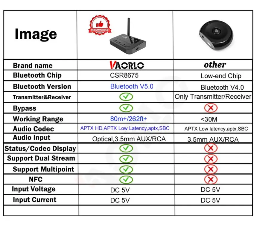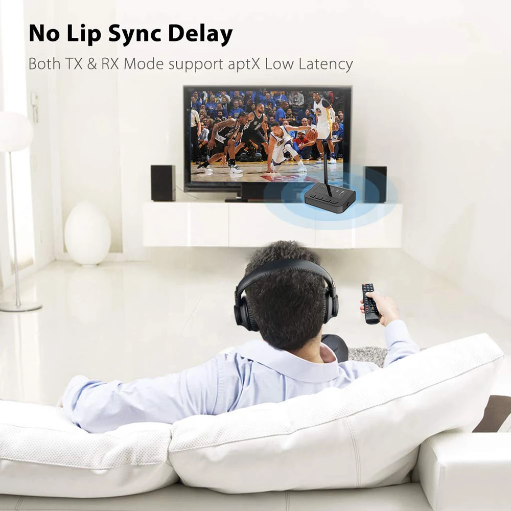 Оснащен самой высокой версией Bluetooth V5.0 и высококлассным чипом CSR8675, чтобы обеспечить лучшую эффективность передачи, стабильность и сверхнизкое энергопотребление, технология aptX с низкой задержкой устраняет задержку звука Bluetooth, И aptX HD предлагает идеальный звук, так что вы можете наслаждаться звуком высокой четкости и смотреть телевизор/Кино/видео идеально в синхронизации.