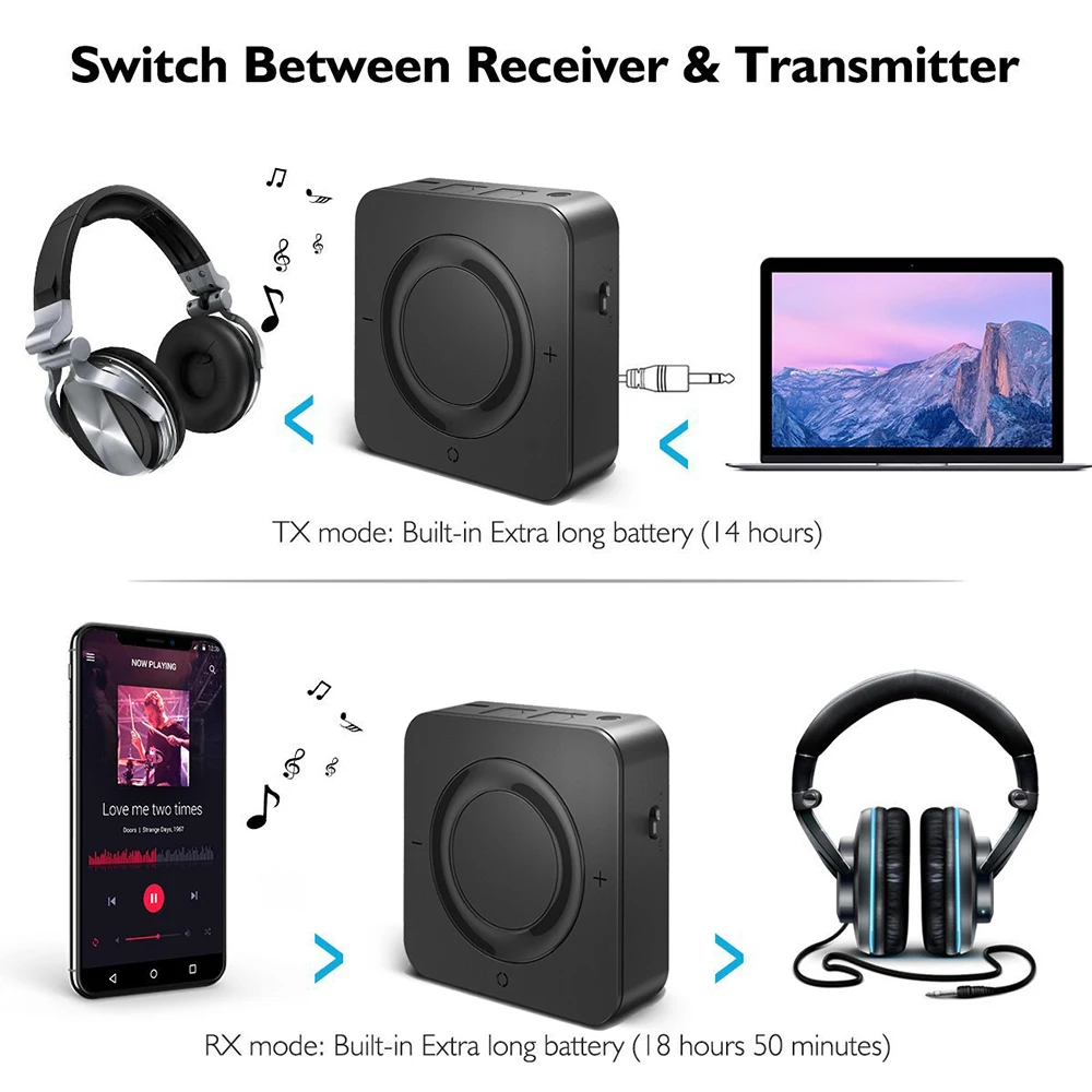 -В режиме TX два bluetooth-наушника могут быть сопряжены сразу, чтобы родители могли смотреть в тишине и дать детям необходимый прорыв; В режиме RX два умных устройства могут быть сопряжены для воспроизведения различных песен. Запись 8 устройств и автоматическое повторное сопряжение с существующими парными устройствами.
