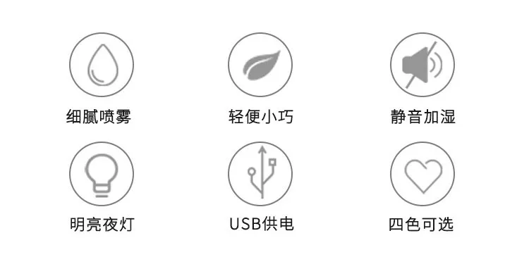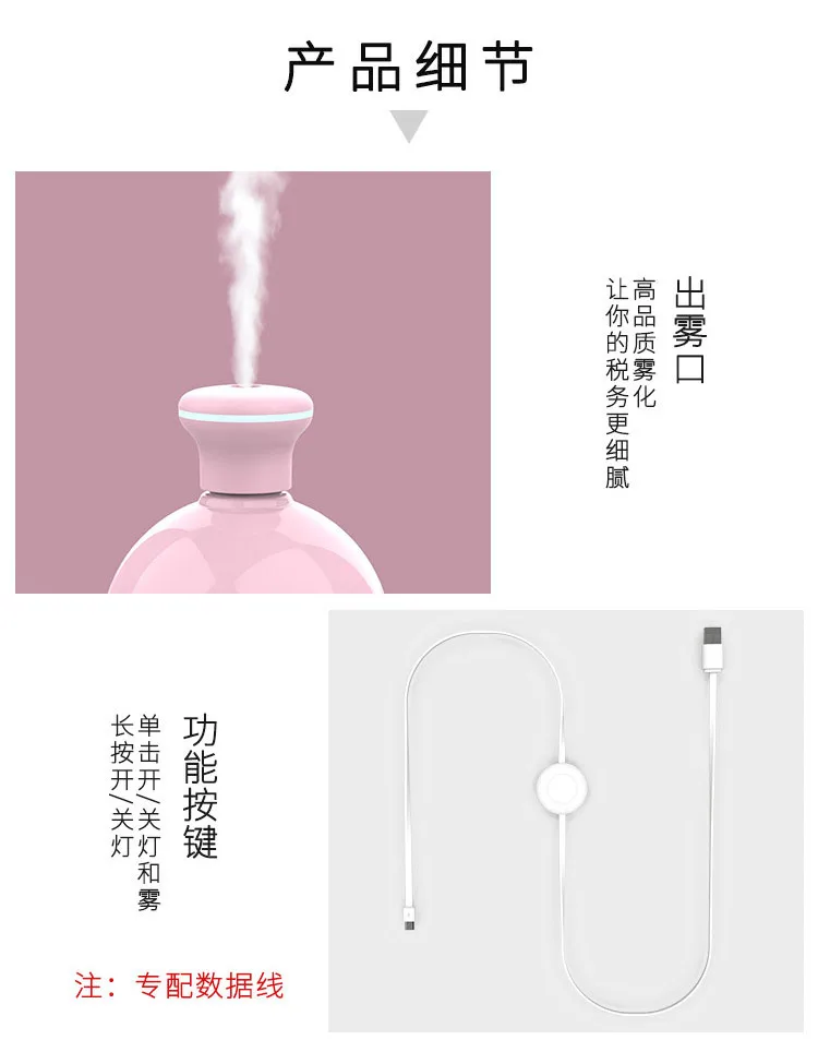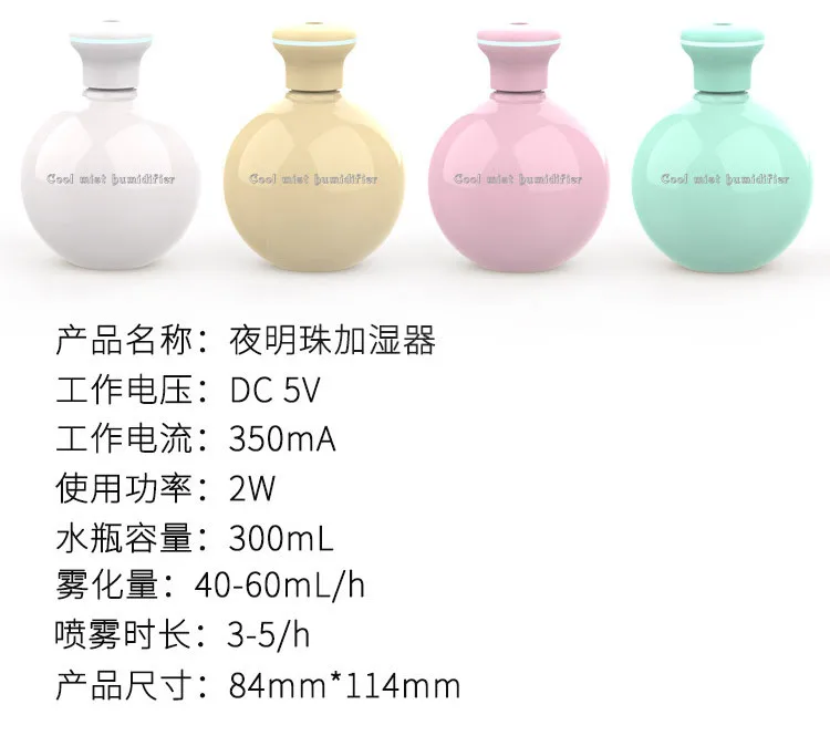 Описание продукта: ● Цвет: белый, синий, розовый ● Размер продукта: 10*10*14 см ● Материал: АБС-пластик ●Voltage: DC5V ●: 4 Вт ● Вес: 0,4 кг ●Applicable площадь: ≦ 10 ㎡ ● Емкость бака: 330 мл ● Количество распылителя: 35 мл/ч ● Режим питания: USB ● Выносливость: 10-18 ч ●Noise: ≤ 38dB ● Отсутствие воды и защита от отключения питания: Да ● Функция: Ароматерапия