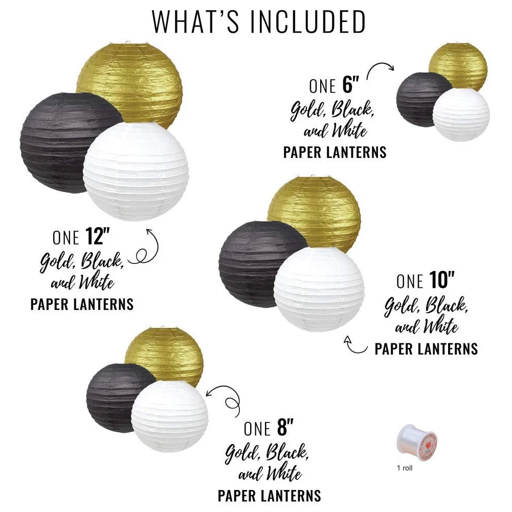 Каждая посылка включает в себя (4) фонарики из белой бумаги, (4) фонарики из золотой бумаги и (4) фонарь из черной бумаги. Один из следующих размеров: 12 дюймов, 10 дюймов, 8 дюймов, 6 дюймов в общей сложности 12. * Все бумажные фонари измеряются в диаметре * Светодиодный светильник в комплект не входит