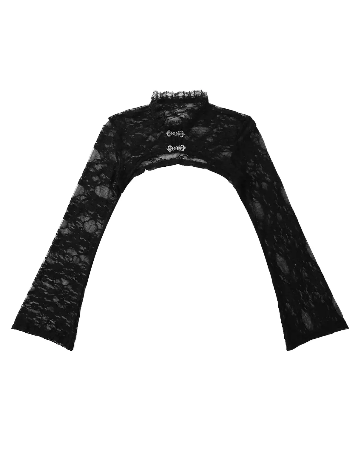Воротник-стойка и длинные расклешенные рукава придают любой вид, с двумя крючками и застежкой на глаза.