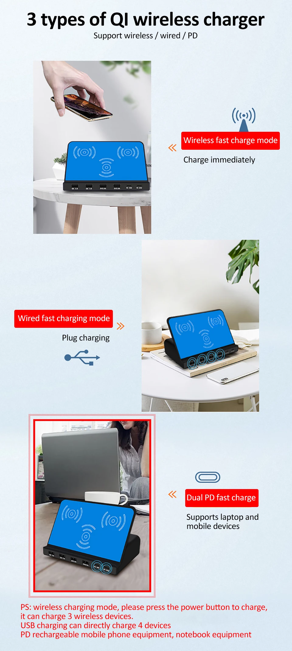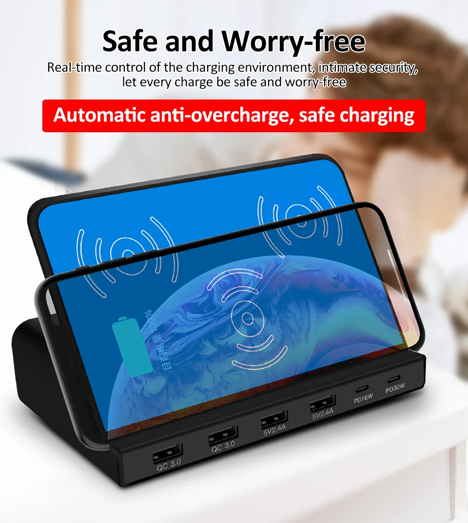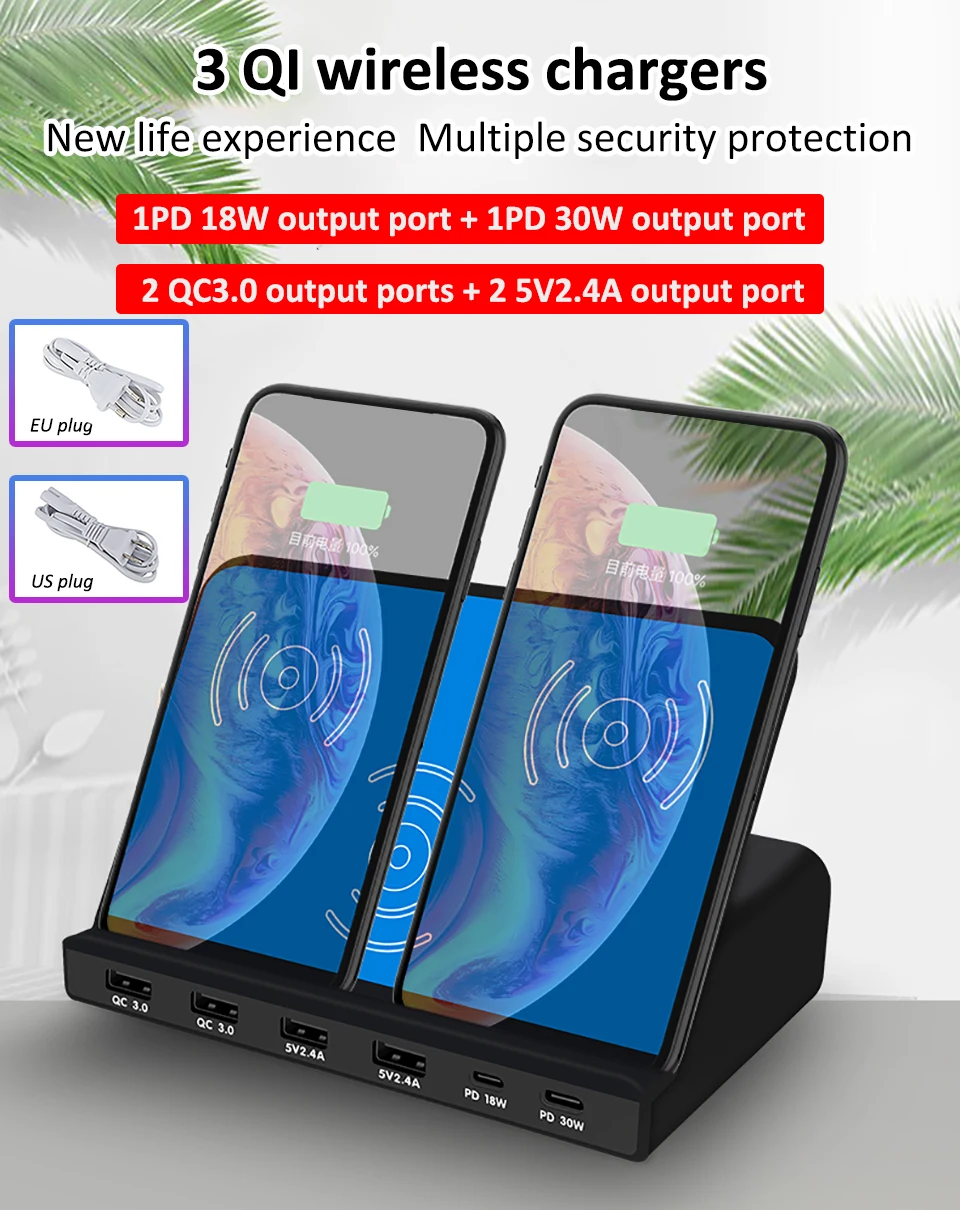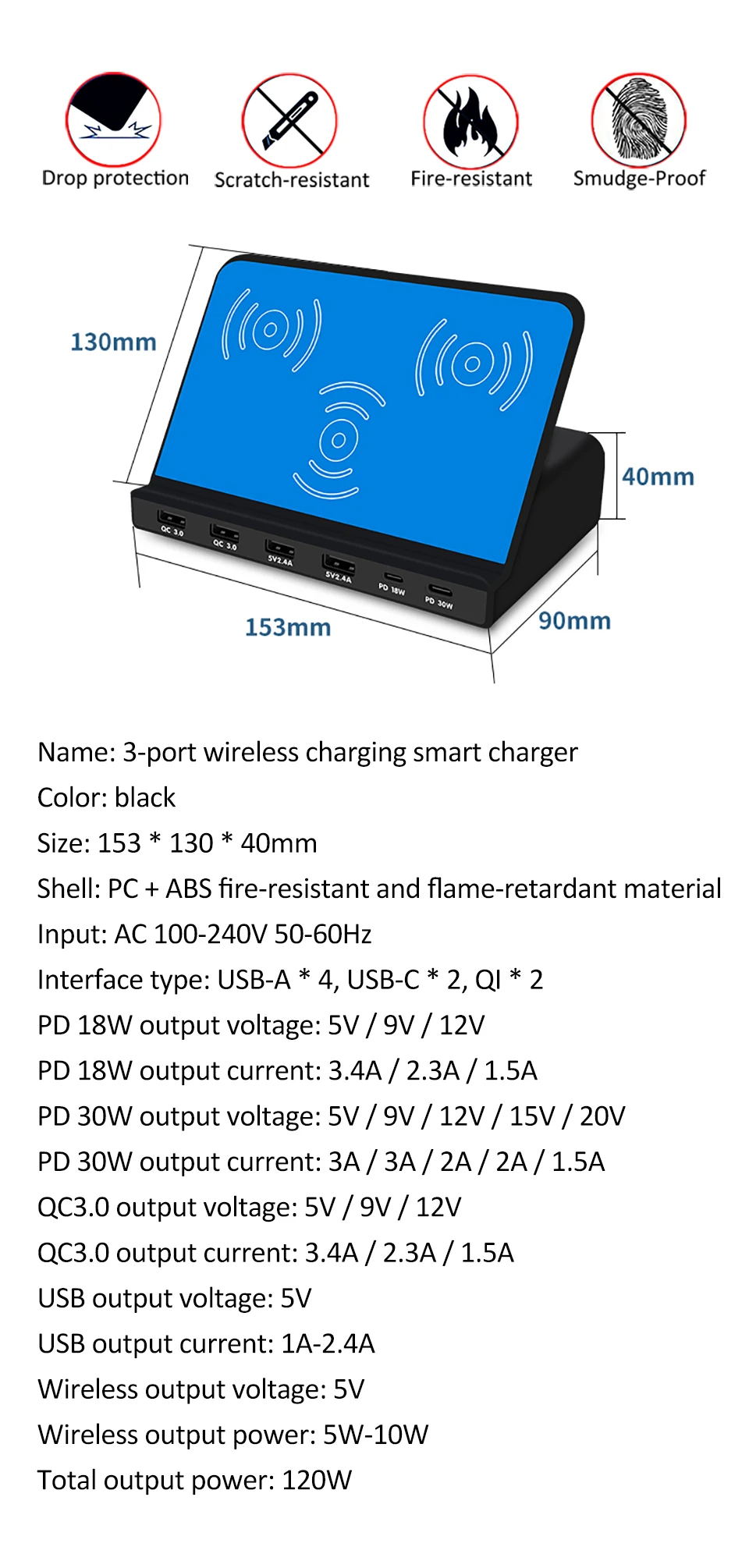 Наименование: зарядное устройство с 3 usb-портами для беспроводной зарядки умное устройство для зарядки Цвет: черный Размер: 153*130*40 мм Внешний материал: PC + ABS огнестойкий и огнестойкий материал Вход: 100-240 В переменного тока 50-60 Гц Тип интерфейса: USB-A * 4, USB-C * 2, QI * 2 PD 18 Вт Выходное напряжение: 5 В/9 В/12 В PD 18 Вт выходной ток: 3.4A / 2.3A / 1.5A PD 30 Вт Выходное напряжение: 5 В/9 В/12 В/15 В/20 в PD 30 Вт выходной ток: 3A / 3A / 2A / 2A / 1.5A Выходное напряжение QC3.0: 5 В/9 В/12 В QC3.0 выходной ток: 3.4A / 2.3A / 1.5A Выходное напряжение USB: 5 В Выходной ток USB: 1A-2.4A Беспроводное Выходное напряжение: 5 В Беспроводная Выходная мощность: 5 Вт-10 Вт Общая выходная мощность: 120 Вт
