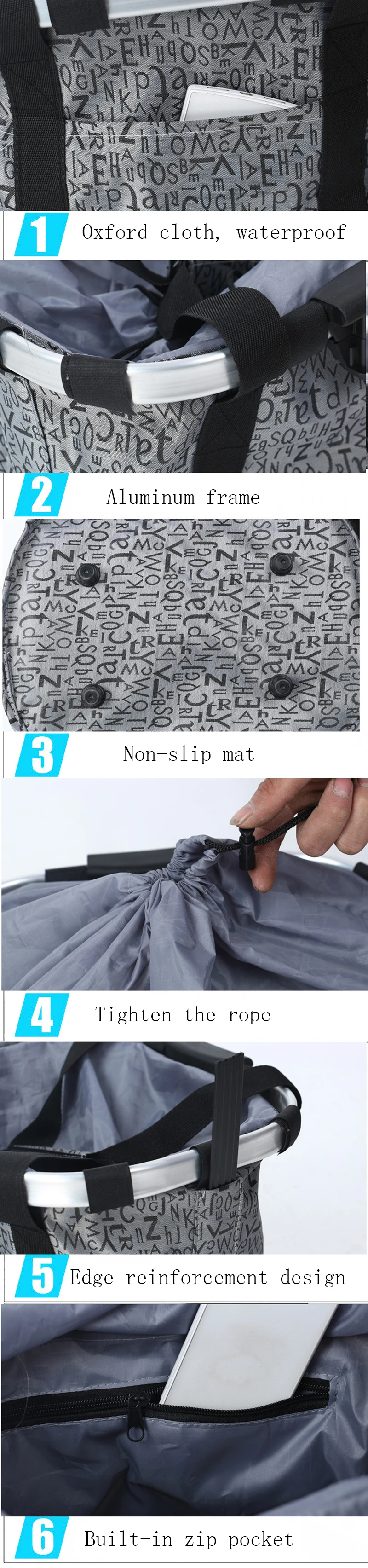 Наименование товара: велосипедная корзина Материал изделия: ткань Оксфорд + алюминиевый сплав Применимые рули: велосипеды с рулем (не подходят для Т-образных рулей), расстояние между рулем и шиной составляет 30 см или более, И диаметр трубки руля не превышает 3 см. Максимальная нагрузка: 10 кг Применение: многофункциональная Передняя велосипедная корзина может быть использована в качестве сумки для покупок, клеток для домашних животных, продуктовых покупок и уличных корзин.