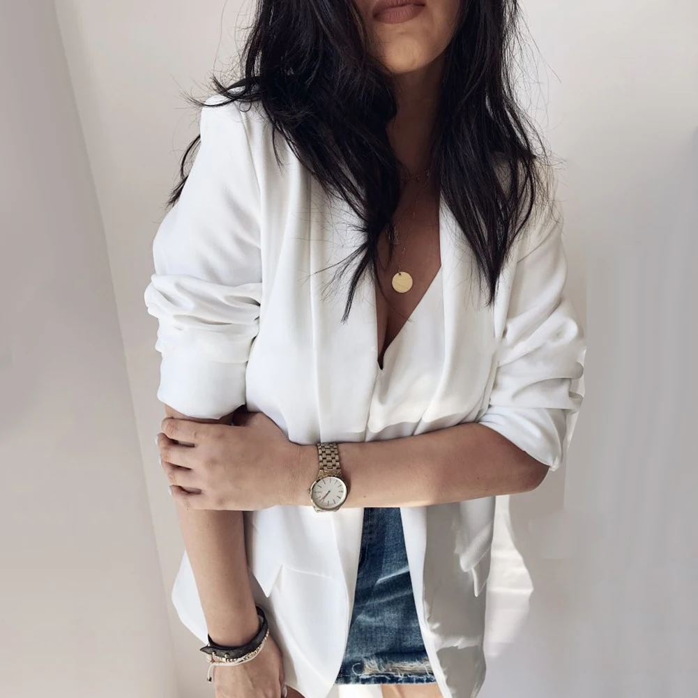 Однотонный блейзер с открытым передом, легко сочетается с повседневной одеждой.