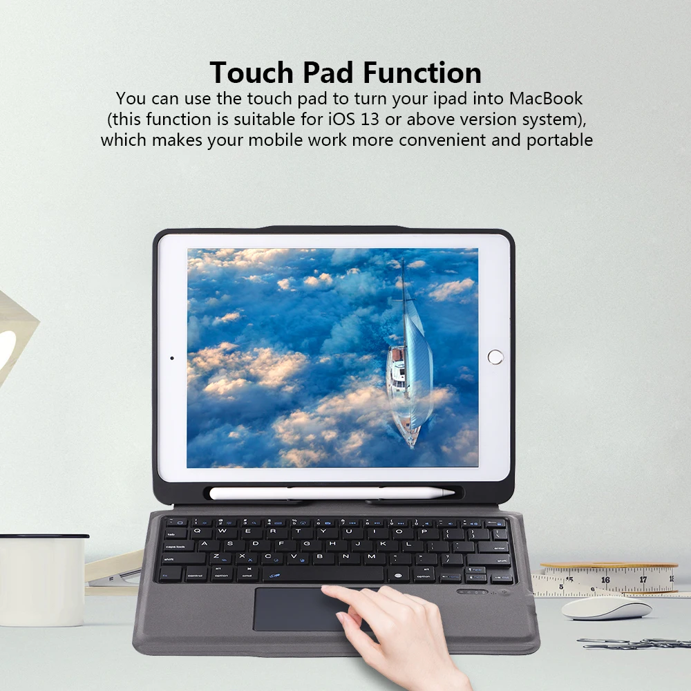 Превратите ваш ipad в MacBook через беспроводную клавиатуру BT3.0 и функцию сенсорной панели мыши (в версии iOS13 выше система может использовать тачпад), обеспечивает более быстрый и комфортный ввод текста и улучшает точность работы, которые делают вашу мобильную работу и развлечения более удобными и портативными.