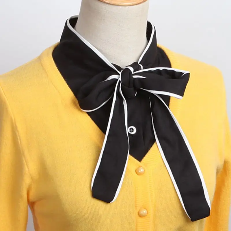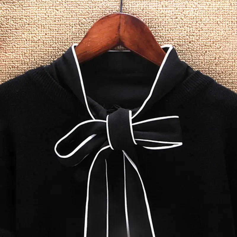 Воротник-стойка, черный кружевной бант с белым краем спереди, черный цвет, застежка на пуговицах.