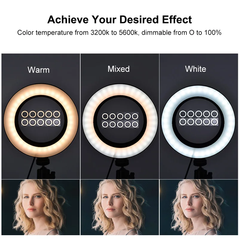 Характеристика Многофункциональное использование; может использоваться в качестве кольцевой лампы и настольной лампы или одной лампы.360 градусов регулируется: легко вращается шаровая Головка, чтобы удовлетворить освещение различных углов съемки.Трехцветное и 10-уровневое затемнение может эффективно удовлетворить различные потребности в освещенииОн широко применяется для фотосъемки, наполнения света в помещении и т. д.Фотографии товара
