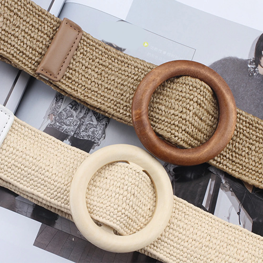 Винтажный плетеный пояс в стиле бохо, Круглый Деревянный широкий ремень с гладкой пряжкой из искусственной соломы