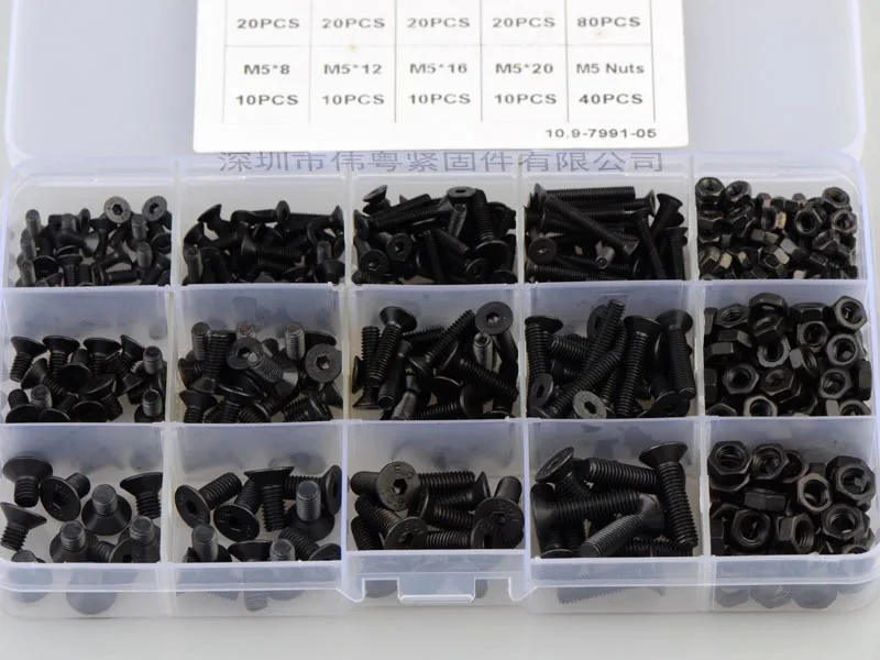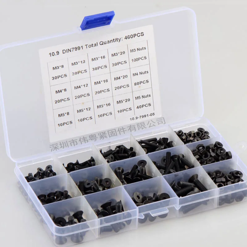 Размер коробки: около 17,6*10,2*2,3 см 460 шт M3 M4 M5 черный высокопрочный потайной головкой шестигранный набор сочетаний винтов 10,9-7991-05 вес нетто продукта: 470 г M3 X 8 30 шт. M4 X 8 20 штук M5 X 8 10 шт.