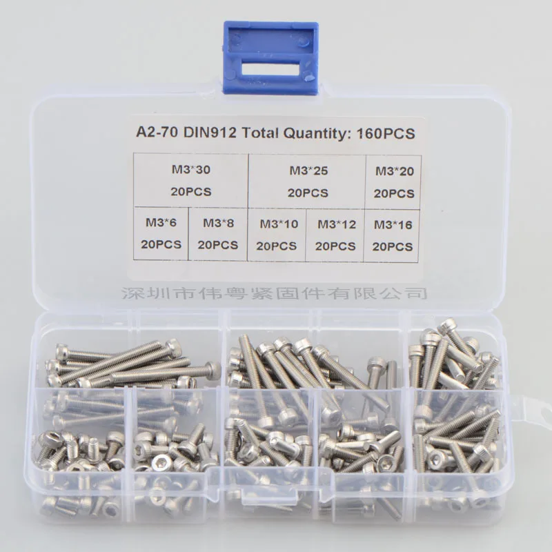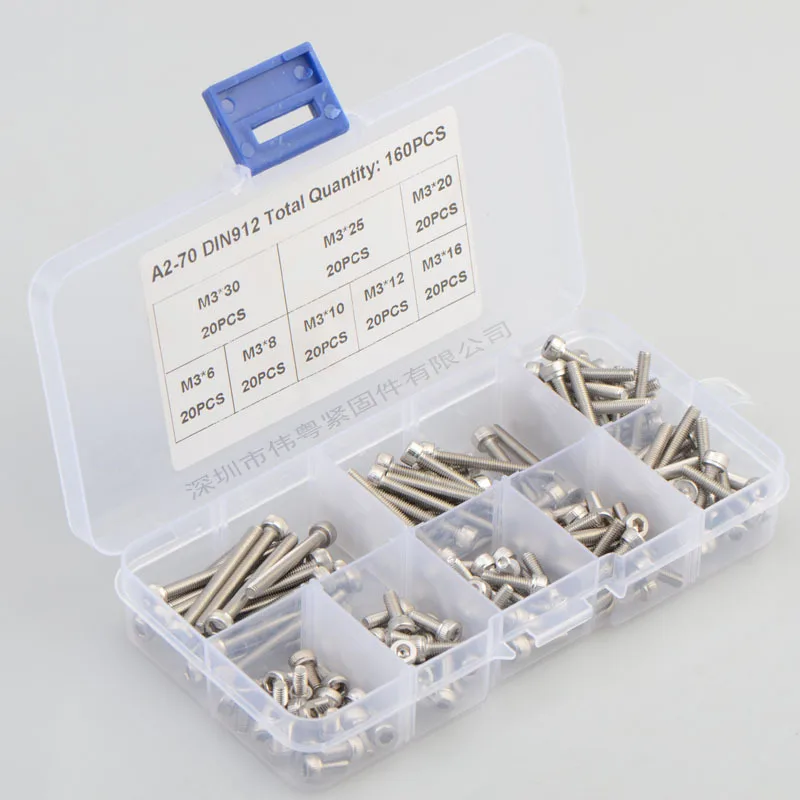 160 шт. M3 * 6/8/10/12/16/20/25/30 нержавеющая сталь 304 головка шестигранной головки комплект винтов A2-912 вес нетто продукта: 199 г