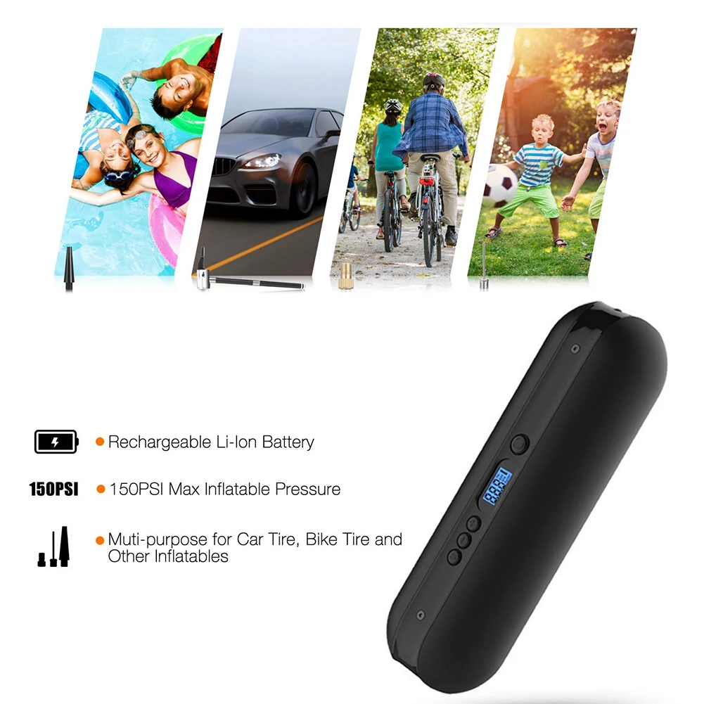 Цвет: белый/черный Размер: 50 мм × 50 мм × 180 мм Вес: 336 г Аккумулятор: 2000 мАч (4*500 мАч 3,2 В) Рабочий ток: 1-5A Режим зарядки: Micro-USB Время зарядки: 2,5 часов Максимальное давление накачивания: 150 фунтов/кв. дюйм и 10,3 бар и 90 кПа и 10,5кгс/см2 Контрольное давление: 2,3-бар (автомобиль) \ 100-120psi (дорожный велосипед) \ 30-50psi (горный велосипед) \ 7-9psi (Баскетбол) Время от пустого: 8 мин (автомобиль) \ 2,5 мин (дорожный велосипед) \ 2 мин (горный велосипед) \ 0,5 мин (Баскетбол) Многоцелевой: автомобильные шины, велосипедные шины, шары, надувные игрушки и т. Д. Список продуктов: 1x надувной 1x воздушная Ванна 1x зарядный кабель usb 1x воздушный шар конвертер 1x клапан конвертер 1x шаровой конвертер 1x крепление на велосипед 1x отвертка 1x винт 1x лента 1x шнурок мешок 1x нескользящий коврик