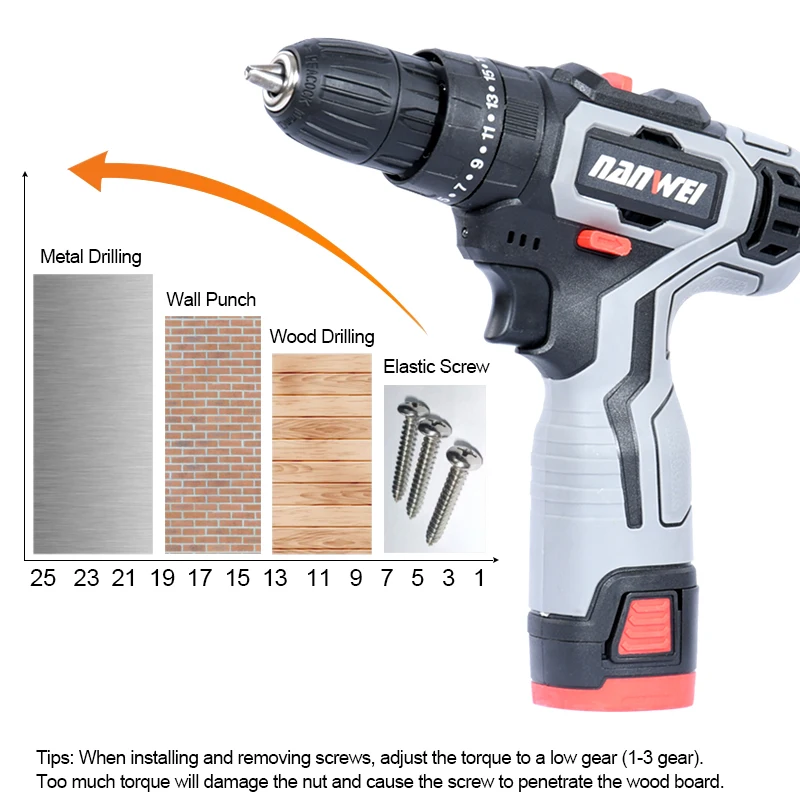 -Сверхмощная беспроводная дрель, обеспечивает до 20н. М крутящего момента и 1350 об/мин скорости.