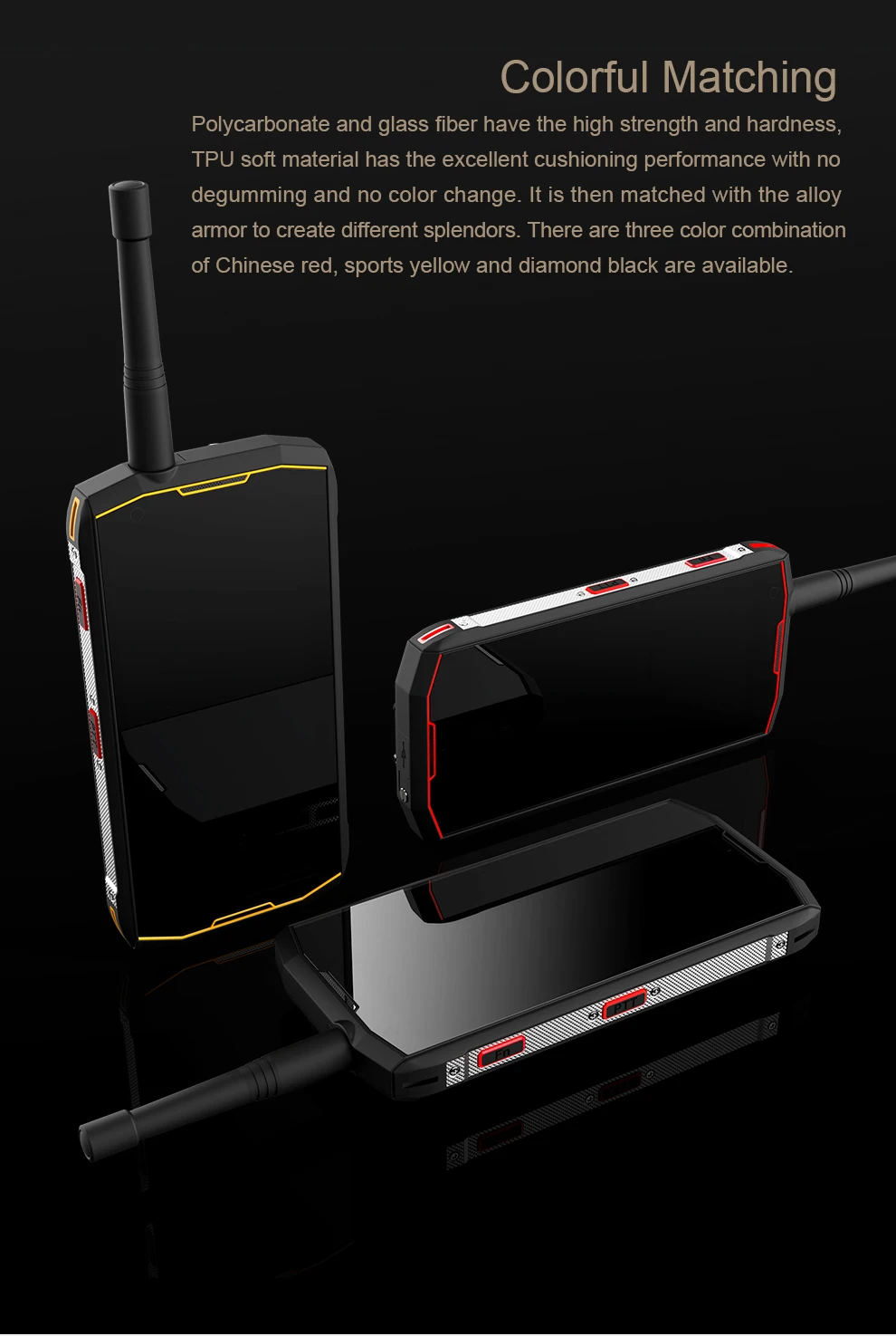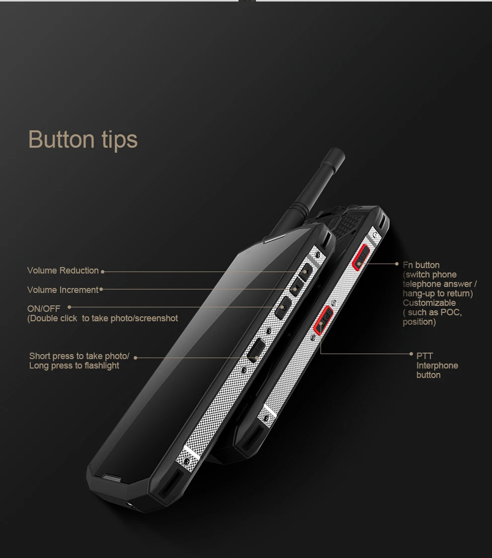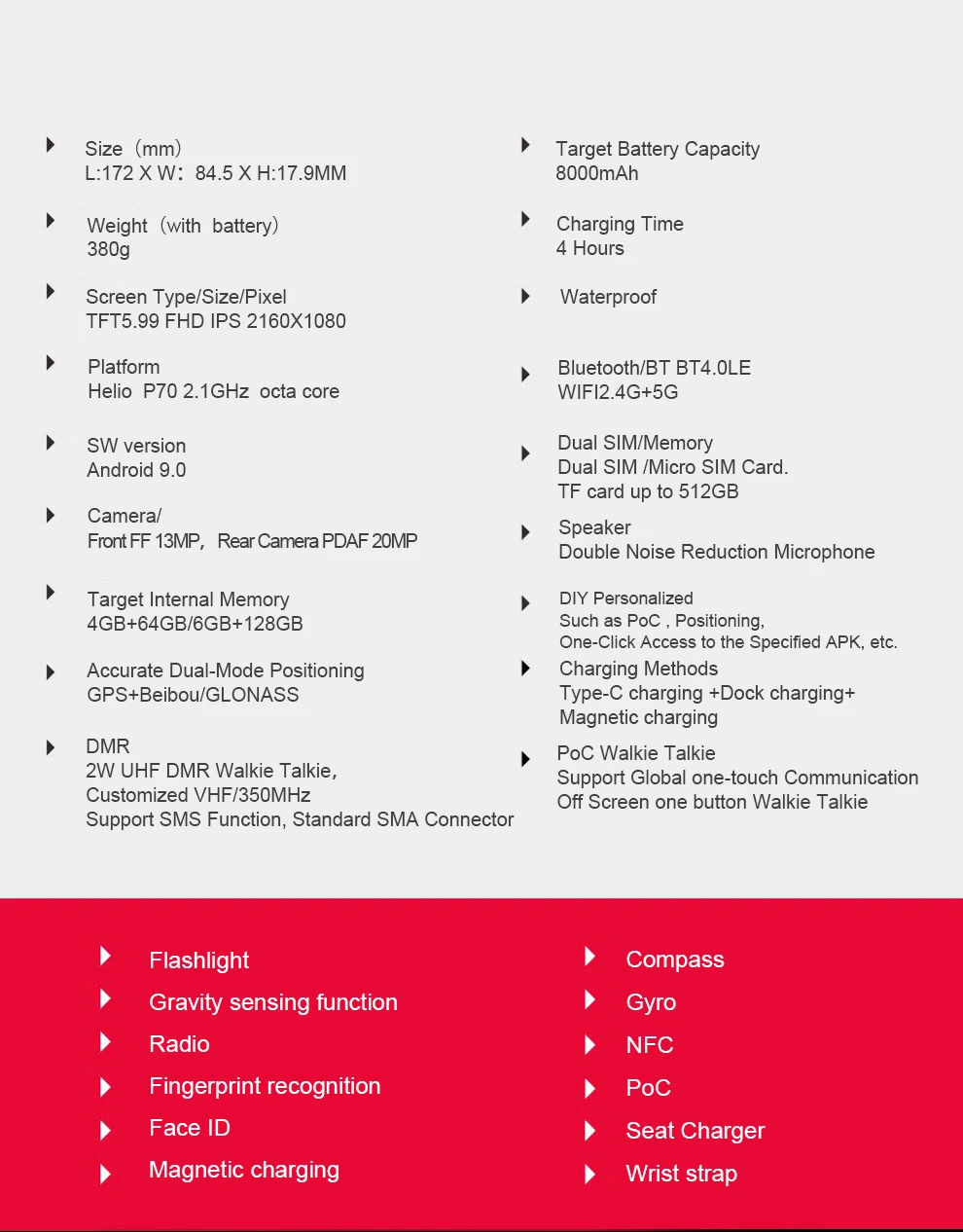 ОС: Android 9,0 Процессор: Helio P70 MTK6771 8-ядерный до 2,1 ГГц Процессор, высокая производительность Sim-карта: две Nano карты Дисплей: 5,99 дюймов 2160*1080 пикселей IPS передача данных, элемент соединения автоматизированной системы управления производством, Грануляция, Горилла 5th Generation Стекло ОЗУ: 4 ГБ/6 ГБ ROM: 64 Гб/128 ГБ Фронтальная камера: 13MP Задняя камера: 20MP PDAF Батарея: 8000 мА-ч Внешняя память: Micro SD карта (T-Flash Card) до 2T, не входит в посылка PTT Интерком: POC/рация ПМР Время работы в режиме ожидания: 800 ч Уровень IP: IP68/водонепроницаемый/пыленепроницаемый/ударопрочный/MIL-STD-810G Сенсор: g-сенсор, светильник, гироскоп, компас, датчик отпечатков пальцев, датчик расстояния Дополнительные характеристики: NFC, FM, POC, PTT, DMR, OTA, OTG Внешние клавиши: боковые клавиши (Громкость +/-), клавиша питания, клавиша PTT, клавиша ответа, клавиша камеры