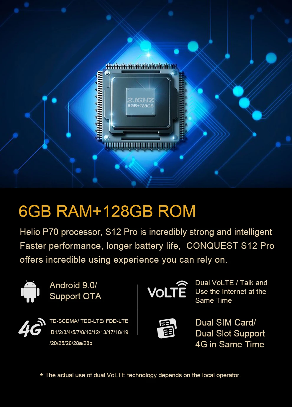 Android 9,0/Поддержка OTA / Double VoLTE/Suppory / TD-SCDMA/ TDD-LTE/ FDD-LTE B1/2/3/4/5/7/8/10/12/13/17/18/19/20/25/26/28a/28b/две sim-карты, двойной слот Поддержка Dual 4G в то же время