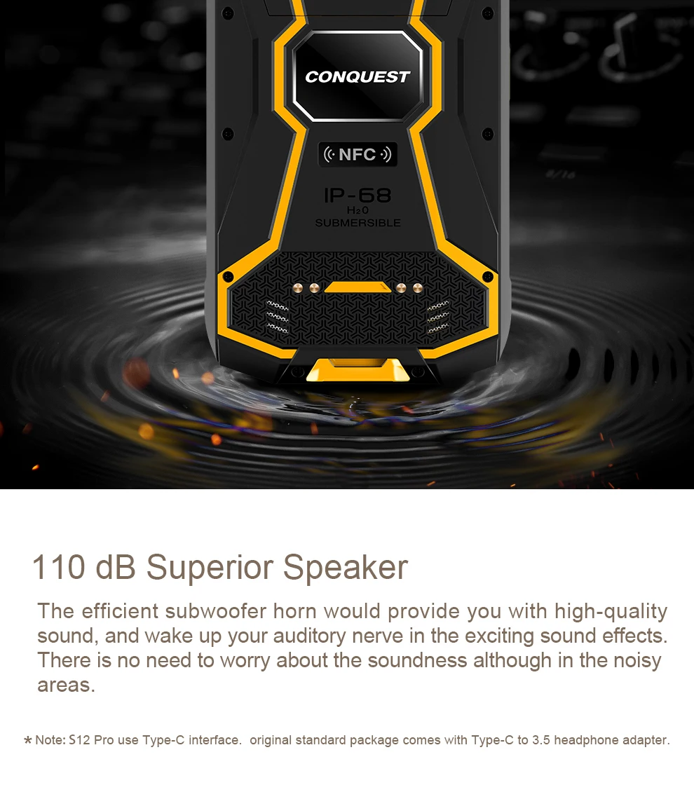 Conquest S12 PRO была строго сертифицирована швейцарской лабораторией SGS, она обладает отличной IP68-grade высокой производительностью, которая включает в себя водонепроницаемость, блокировку и устойчивость к давлению, благодаря своей строгой конструкции он может использоваться в обычных условиях даже в условиях затопления пыли.