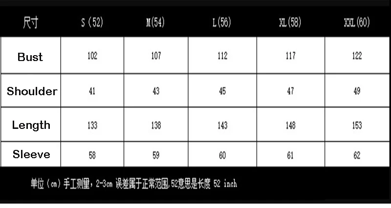 S: ширина плеч 41 см, обхват груди 102 см, длина рукава 58 см, длина 133 см M: ширина плеч 43 см, обхват груди 107 см, длина рукава 59 см, длина 138 см L: Плечо 45 см, обхват груди 112 см, рукав 60 см, длина 143 см XL: ширина плеч 47 см, обхват груди 117 см, длина рукава 61 см, длина 148 см XXL: плечо 49 см, бюст 122 см, рукав 62 см, длина 153 см