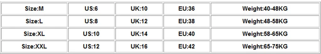 Размер США Великобритания ЕС Вес М 6 10 36 40-48 кг L 8 12 38 48-58 кг XL 10 14 40 58-65 кг XXL 12 16 42 65-75 кг