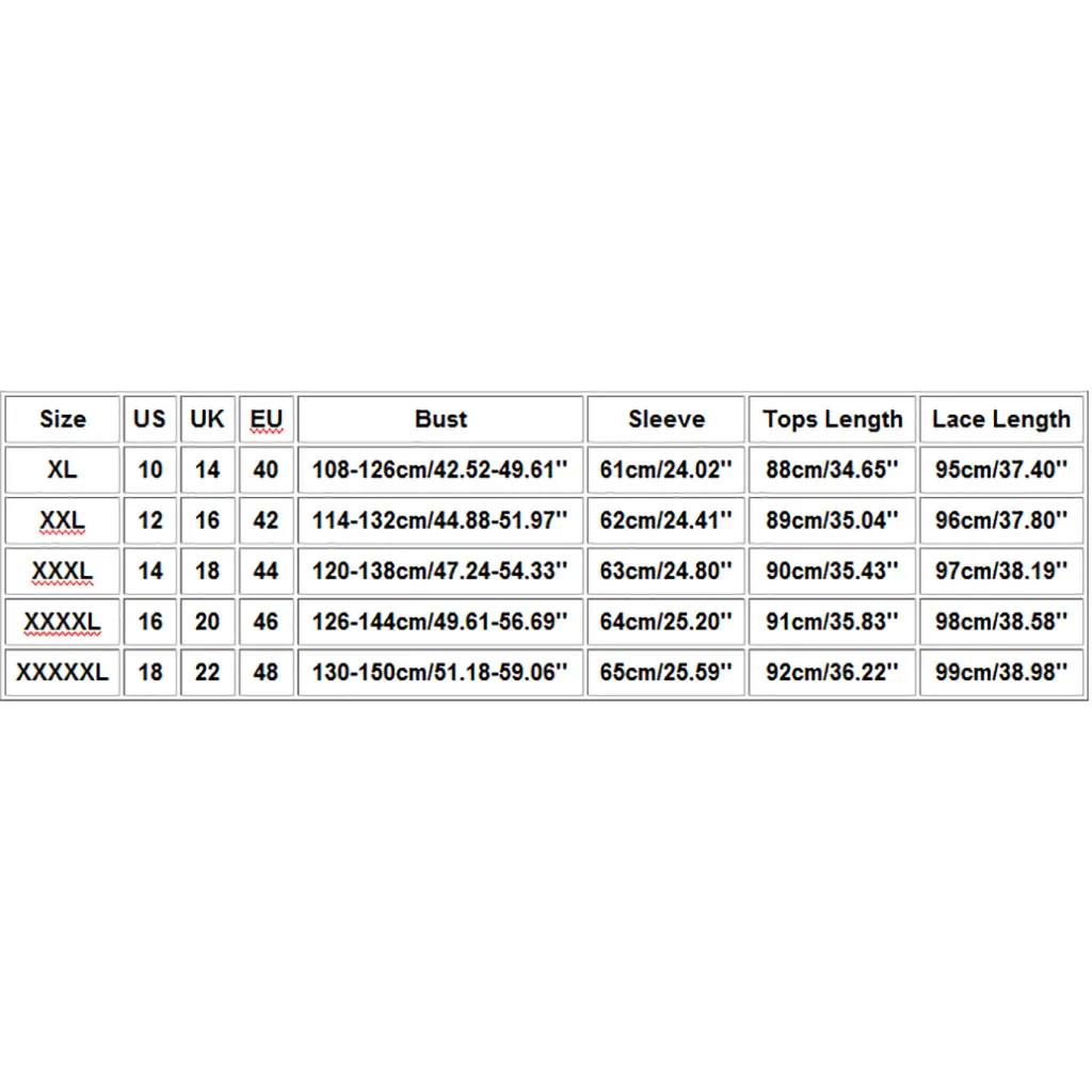 То, что вы Получите: 2 женских топаРазмеры Свяжитесь с нами Великобритания ЕС Обхват груди Рукава Топы Длина Кружево Длина XL 10 14 40 108-126 см/42,52-49,61'' 61 см/24,02'' 88 см/34,65'' 95 см/37,40'' XXL 12 16 42 114-132 см/44,88-51,97'' 62 см/24,41'' 89 см/35,04'' 96 см/37,80'' XХХL 14 18 44 120-138 см/47,24-54,33'' 63 см/24,80'' 90 см/35,43'' 97 см/38,19'' XXXXL 16 20 46 126-144 см/49,61-56,69'' Высота голенища 64 см; 25,20'' 91 см/35,83'' 98 см/38,58'' XXXXXL 18 22 48 130-150 см/51,18-59,06'' 65 см/25,59'' 92 см/36,22'' 99 см/38,98''
