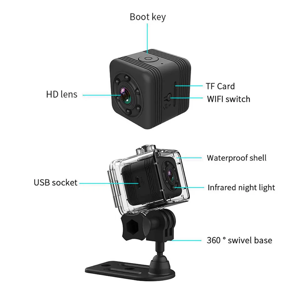 • 30 м водонепроницаемый дизайн для высокой производительности • Поддержка циклической записи в tf-карте: Нет необходимости удалять предыдущее видео. • Инфракрасное Ночное Видение: 6 инфракрасных ламп, мощный эффект ночного видения. -Мини-размер: небольшой форм-фактор, портативный Портативный DV DC, подходит для различных случаев. • Подключение Wi-Fi: Поддержка только Wifi, передача видео в режиме реального времени, вы также можете использовать управление wifi. • Долгое время работы: встроенный литий-ионный аккумулятор 300 мАч, время работы до 240 минут.