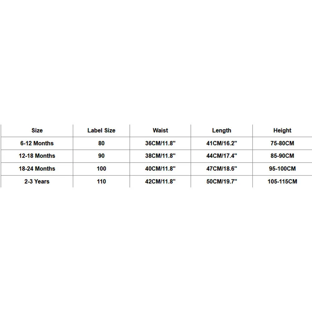 Размер Размер этикетки Талия Длина Высота 6-12 месяцев 80 36 см/11,8" 41 см/16,2" 75-80 см 12-18 месяцев 90 38 см/11,8" 44 см/17,4" 85-90 см 18-24 месяцев 100 40 см/11,8" 47 см/18,6" 95-100 см От 2 до 3 лет 110 42 см/11,8" 50 см/19,7" 105-115 см