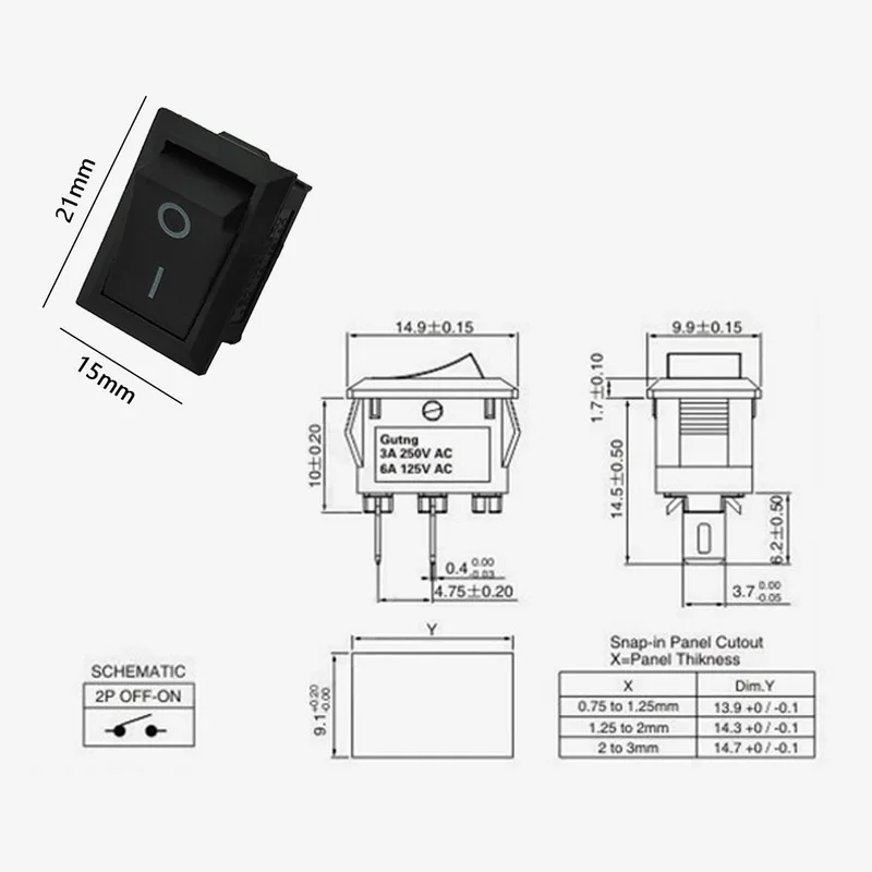 110 V 250 V KCD1-101 2-контактный кнопочный переключатель включения/выключения 21*15 мм