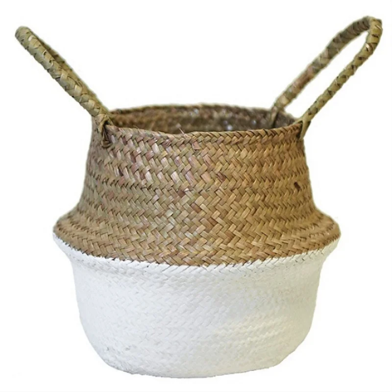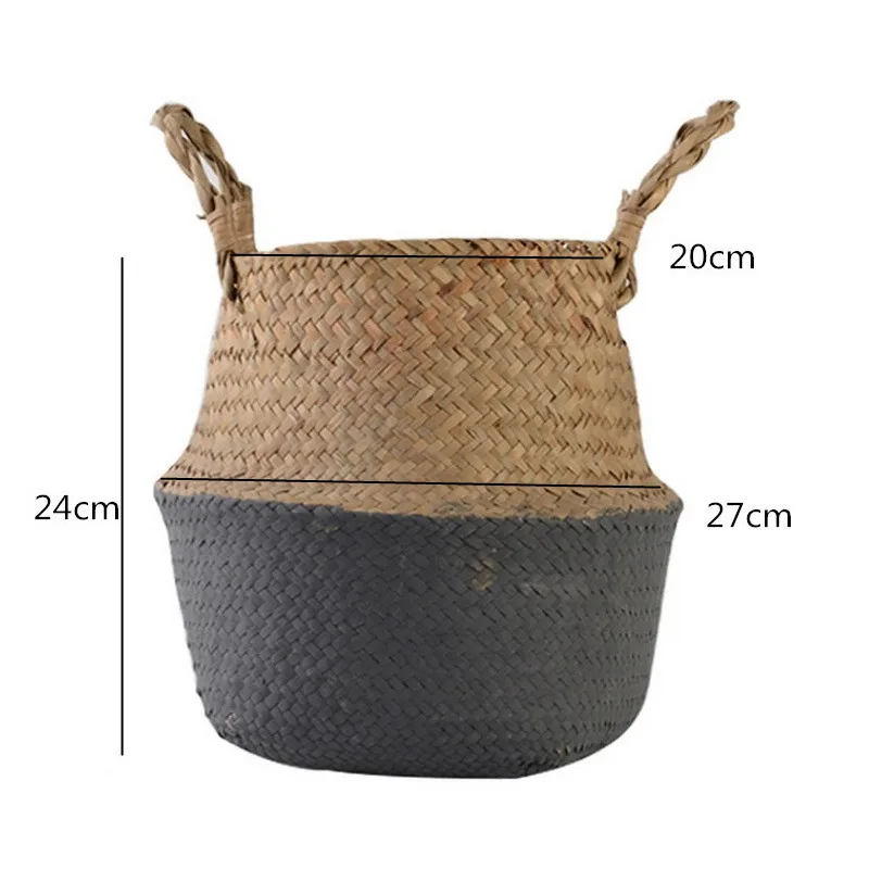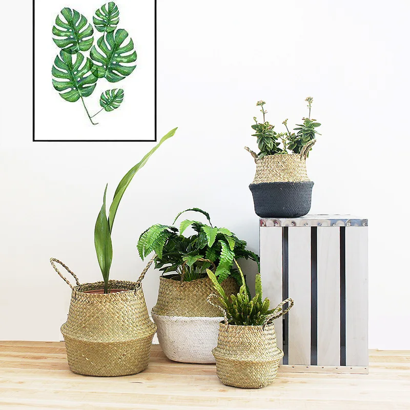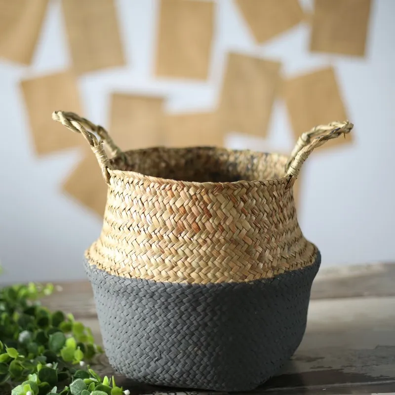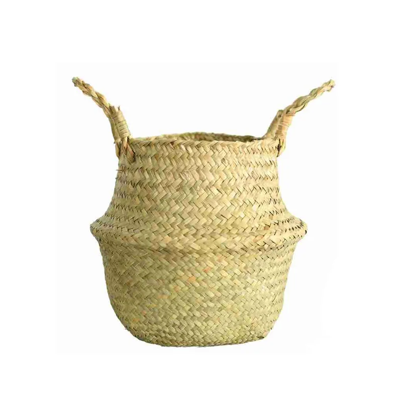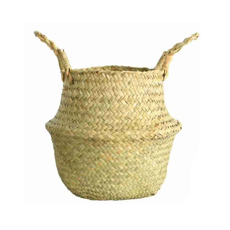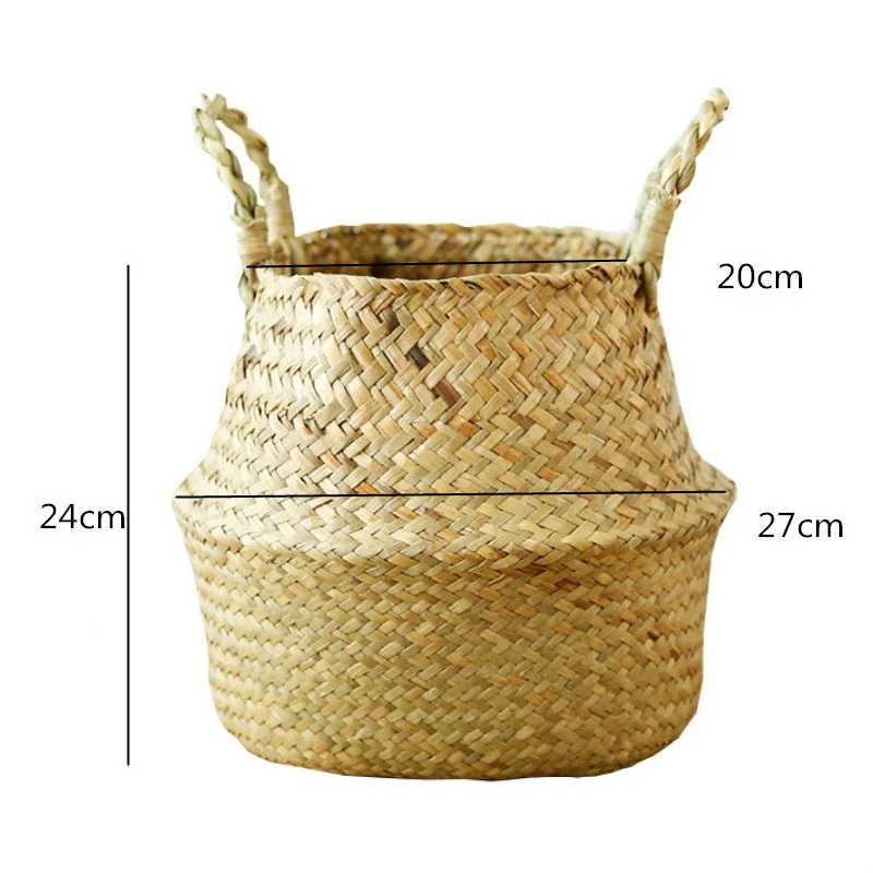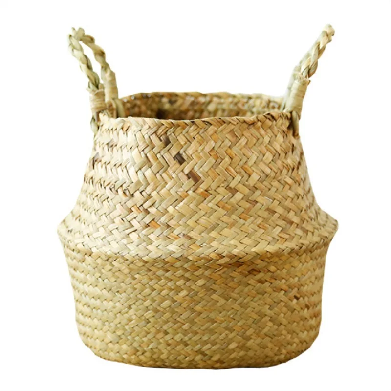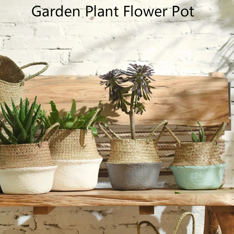1Pc Garden Plant Flower Pot Handmade Rattan Storage Basket Foldable Seagrass Straw Hanging Woven Handle Toy Storage Container