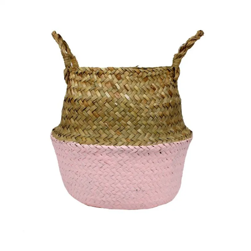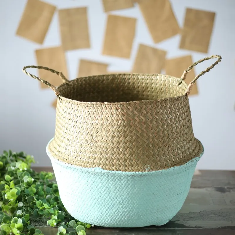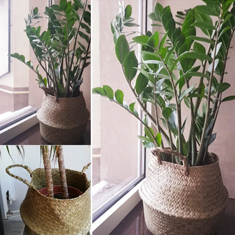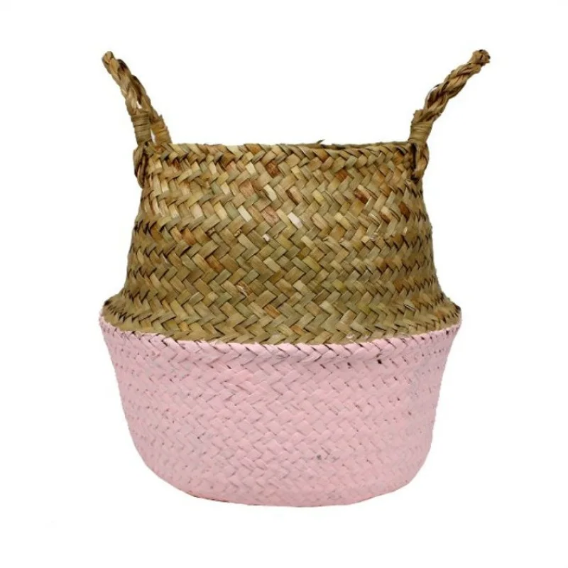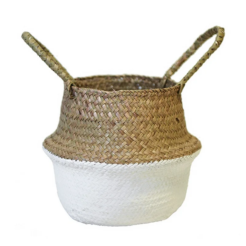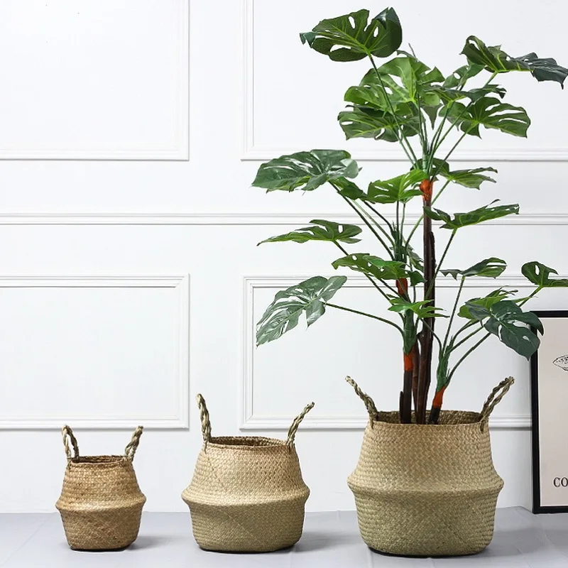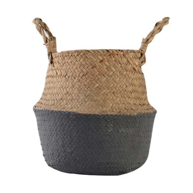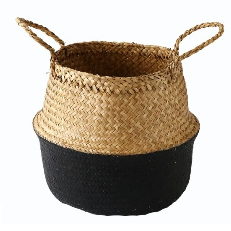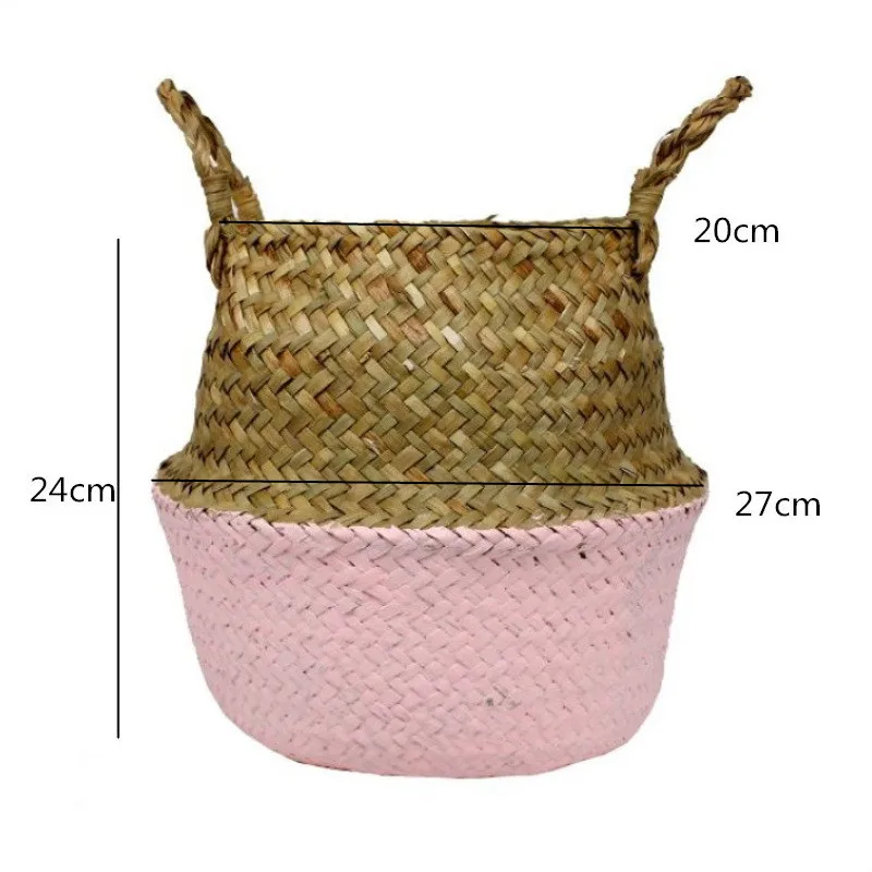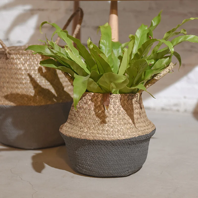 1Pc Garden Plant Flower Pot Handmade Rattan Storage Basket Foldable Seagrass Straw Hanging Woven Handle Toy Storage Container