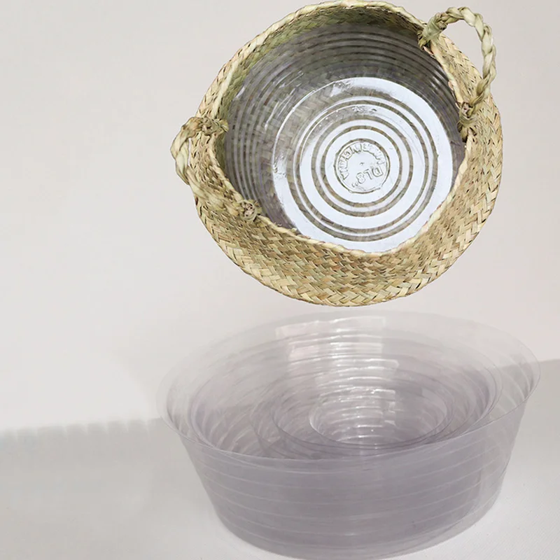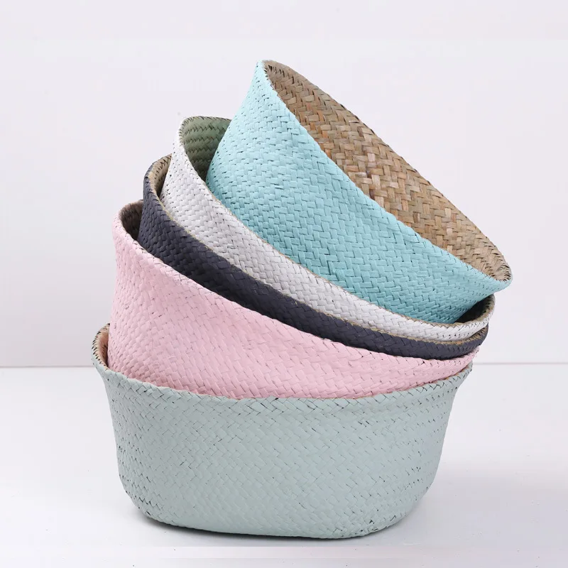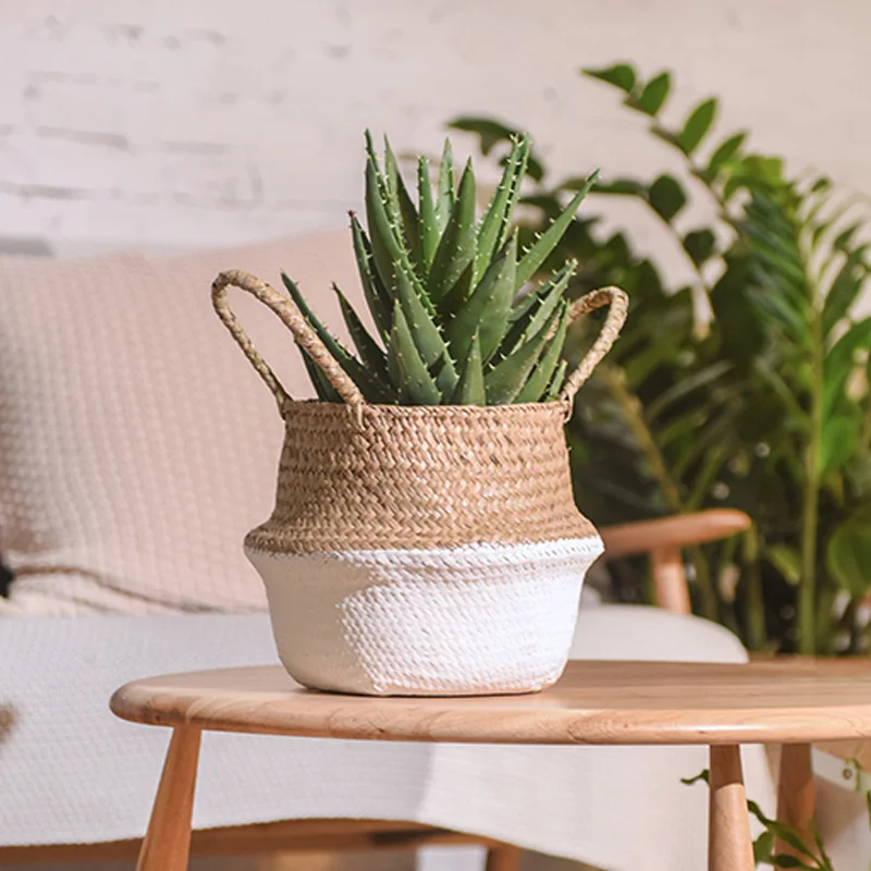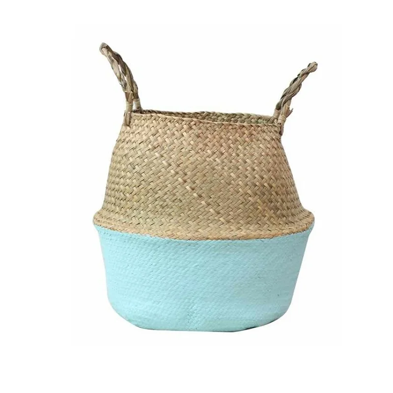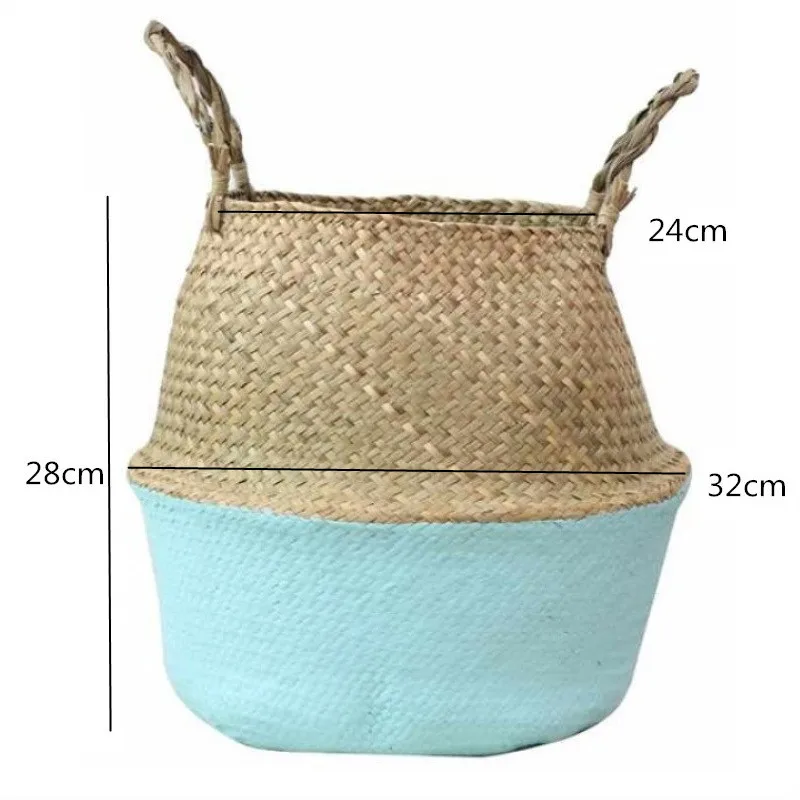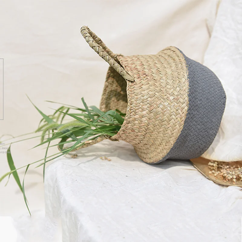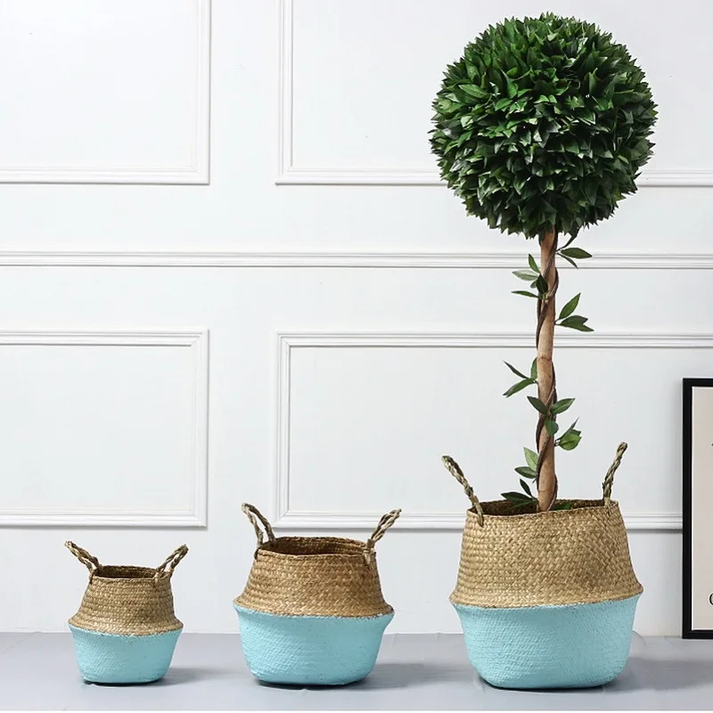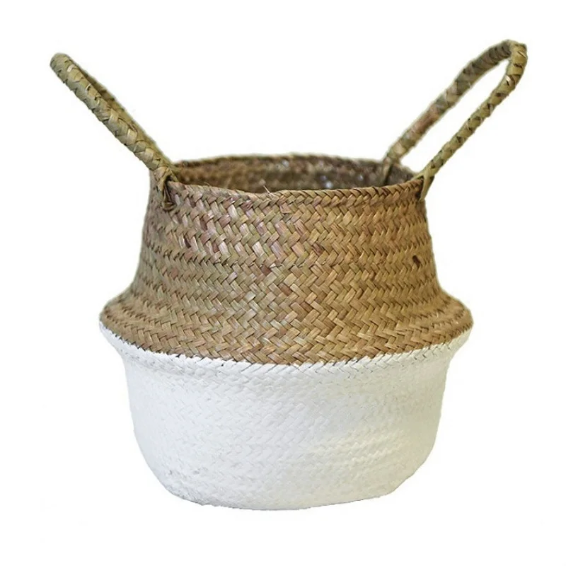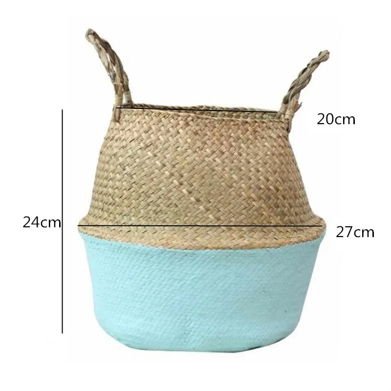 1Pc Garden Plant Flower Pot Handmade Rattan Storage Basket Foldable Seagrass Straw Hanging Woven Handle Toy Storage Container