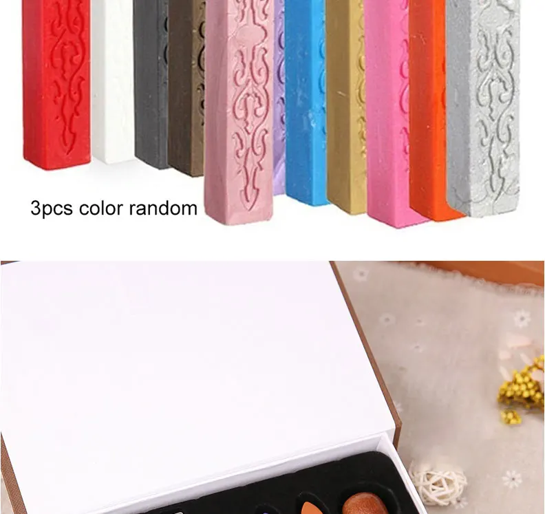 Посылка: воск * 3 (случайный цвет), штамп * 1, белый воск * 2, ложка * 1 Диаметр уплотнения: 25-30 мм Вес: 300 г