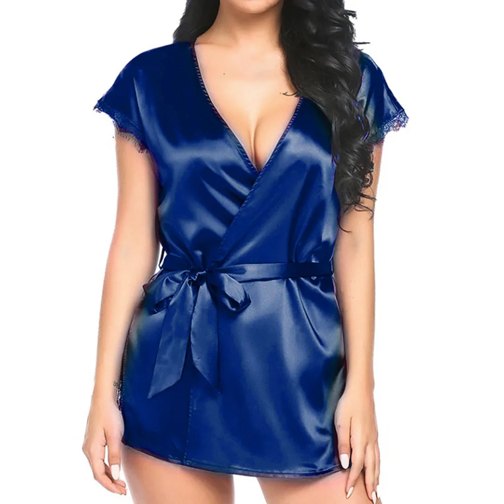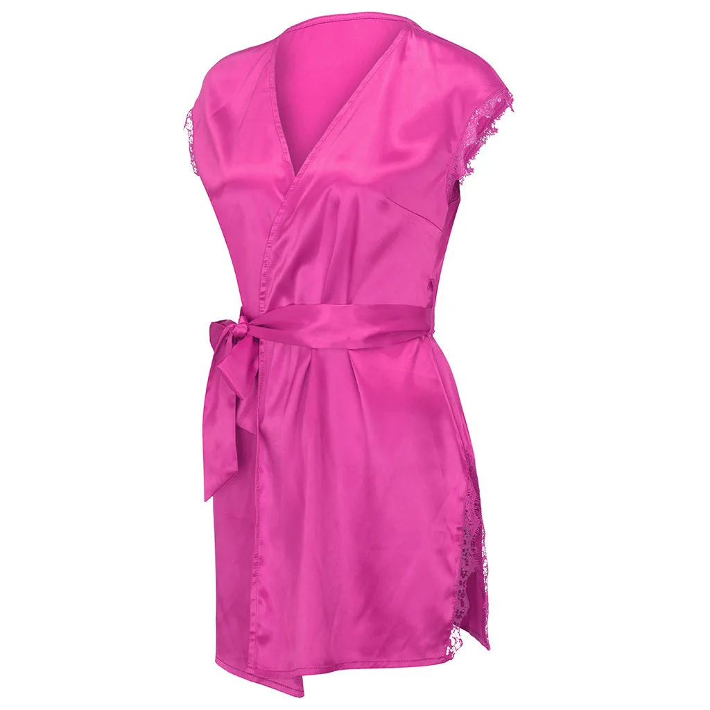 Модная атласная женская ночная сорочка, сексуальная однотонная кружевная отделка с v-образным вырезом и короткими рукавами, одежда для сна с поясом Koszula Nocna, новинка 2020, хит продаж