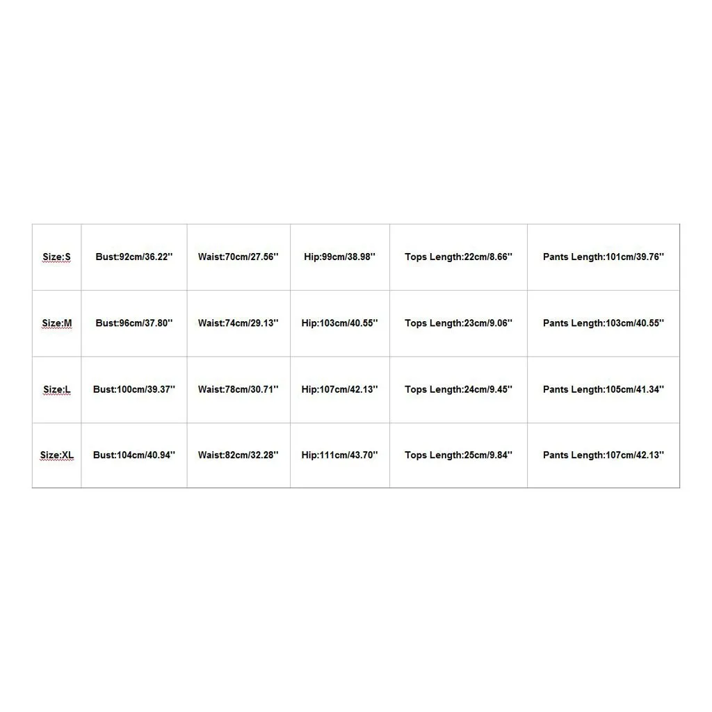 Обратите внимание что небольшая разница в цвете считается приемлемой. Это может быть связано с положением источника света и с настройками экрана. Размеры Обхват груди Обхват талии Обхват бедер Топы Длина Брюки Длина S 92 см/36,22'' 70 см/27,56'' 99 см/38,98'' 22 см/8,66'' 101 см/39,76'' М 96 см/37,80'' 74 см/29,13'' 103 см/40,55'' 23 см/9,06'' 103 см/40,55'' L 100 см/39,37'' 78 см/30,71'' 107 см/42,13'' 24 см/9,45'' 105 см/41,34'' XL 104 см/40,94'' 82 см/32,28'' 111 см/43,70'' 25 см/9,84'' 107 см/42,13''