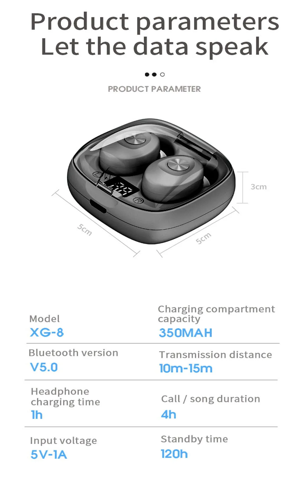 Модель: XG-8 Цвет: черный Материал: АБС-пластик Версия BT: 5,0 + EDR Напряжение зарядки: 5 В постоянного тока Наушники Время зарядки: 0,8 h Наушники Время разговора: 3 часа Наушники время работы в режиме воспроизведения музыки: 3,5 h Наушники время работы в режиме ожидания: 120h Зарядный чехол для зарядки Время работы: 1,5 h Рабочее расстояние: >10 м Класс водонепроницаемости: IPX6 Зарядный Чехол B-attery: 3,7 V, 350 мАч литий-полимерный B-attery Наушники B-attery: 3,7 V 50 мАч литий-полимерный B-attery Функция: B-attery Дисплей, голос Управление, Функция, объем вонтрол Чехол для наушников Размеры: 22x17 мм /0,87 x 0.67in Примечание: 1. Из-за различных Экран дисплея и светильник эффект, фактический цвет элемента может быть Немного отличается от цвета, показанного на фотографиях. 2. Пожалуйста, имейте в виду, что немного Погрешность измерений из-за ручного измерения.Посылка список:
