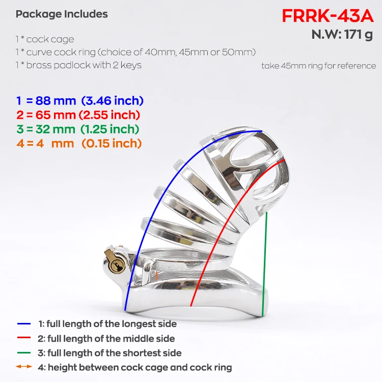 1- The differences of 43 43A: 43 - round cock ring 43A - curve cock ring S: cock ring dia is 40mm M: cock ring dia is 45mm L: cock ring dia is 50mm Important: Sex toys dimension tolerance does exist, due to the below 3 reasons and this tolerance (±1cm) generally is considered to be allowed. Please do NOT make the purchase if it is not acceptable for you. a) sex toys is in irregular shape b) the measurement methods varies c) the sex toys material characteristics 2- Package Includes 1 set of cock cage set