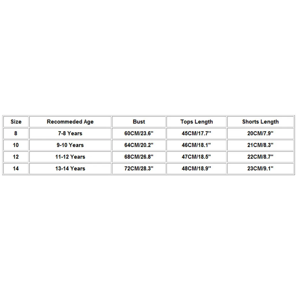 Размеры Рекомендуемый возраст Обхват груди Топы Длина Шорты Длина 8 От 7 до 8 лет 60 см/23,6" 45 см/17,7'' 20 см/7,9" 10 От 9 до 10 лет Высота голенища 64 см/20,2" 46 см/18,1" 21 см/8,3" 12 11-для детей 12 лет 68 см/26,8" 47 см/18,5" 22 см/8,7" 14 Возраст: от 13 до 14 лет 72 см/28,3" 48 см/18,9'' 23 см/9,1"