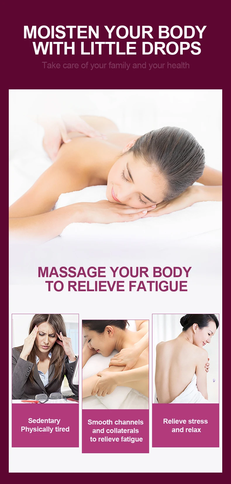 Нанесите правильный светильник и Расслабляющее массажное масло, равномерно нанесите на кожу спины, массируйте с помощью профессиональных методов до впитывания.