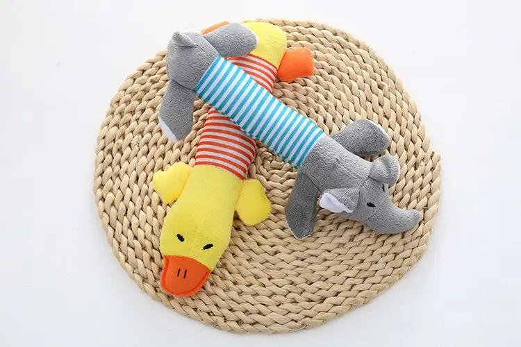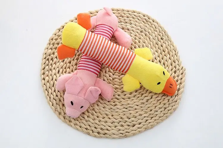 [Наименование товара]: плюшевая игрушка со звуком [Материал]: плюш, встроенный генератор Материал: Розовая свинка. Серый слон, желтая утка [Характеристики]: устойчивость к укусам, шлифовка зубов, звук