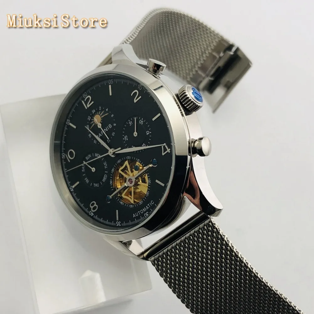 Parnis Новинка 43 мм Серебряный чехол с черным циферблатом и датой из нержавеющей стали водонепроницаемые автоматические мужские механические часы с маховиком для отдыха