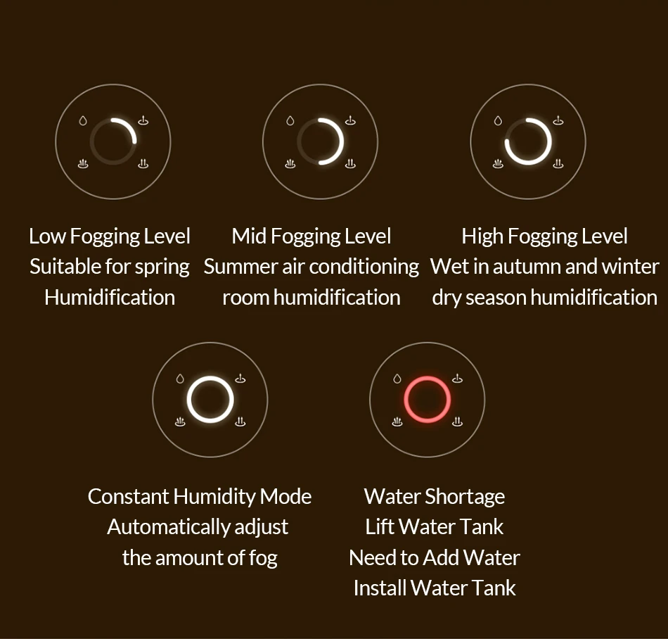 Главные особенности: ● UV-C мгновенный стерилизации ● Портативный дизайн воды, удобно добавлять воду без разделения резервуара для воды ● Прозрачная Сегментированная петля состояния, прозрачный резервуар для визуализации ● Высокочастотная автоматизированная система керамического сердечника, мягкий окружающий свет, круглое входное отверстие в нижней части, комбинированный спрей ● Режим постоянной влажности может автоматически регулировать количество тумана ● Управление через приложение MiHome, увлажнение с помощью пульта дистанционного управления