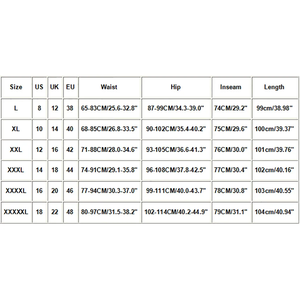 Размер США Великобритания ЕС Талия Бедра Внутренний шов Длина L 8 12 38 65-83 см/25,6-32,8" 87-99 см/34,3-39,0" 74 см/29,2" 99 см/38,98'' XL 10 14 40 68-85 см/26,8-33,5" 90-102 см/35,4-40,2" 75 см/29,6" 100 см/39,37'' XXL 12 16 42 71-88 см/28,0-34,6" 93-105 см/36,6-41,3" 76 см/30,0" 101 см/39,76'' XХХL 14 18 44 74-91 см/29,1-35,8" 96-108 см/37,8-42,5" 77 см/30,4" 102 см/40,16'' XXXXL 16 20 46 77-94 см/30,3-37,0" 99-111 см/40,0-43,7" 78 см/30,8" 103 см/40,55'' XXXXXL 18 22 48 80-97 см/31,5-38,2" 102-114 см/40,2-44,9" 79 см/31,1" 104 см/40,94''