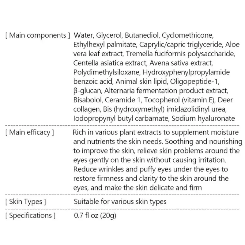 Он богат различными растительными экстрактами для добавления влаги и питания, необходимого коже. Успокаивает и питает и улучшает кожу, смягчает проблемы с кожей. Глаза мягко сидят на коже, не вызывая раздражения. Уменьшает морщины и отечность под веками, восстанавливает упругость и четкость окружающей кожи, делает кожу нежной и упругой