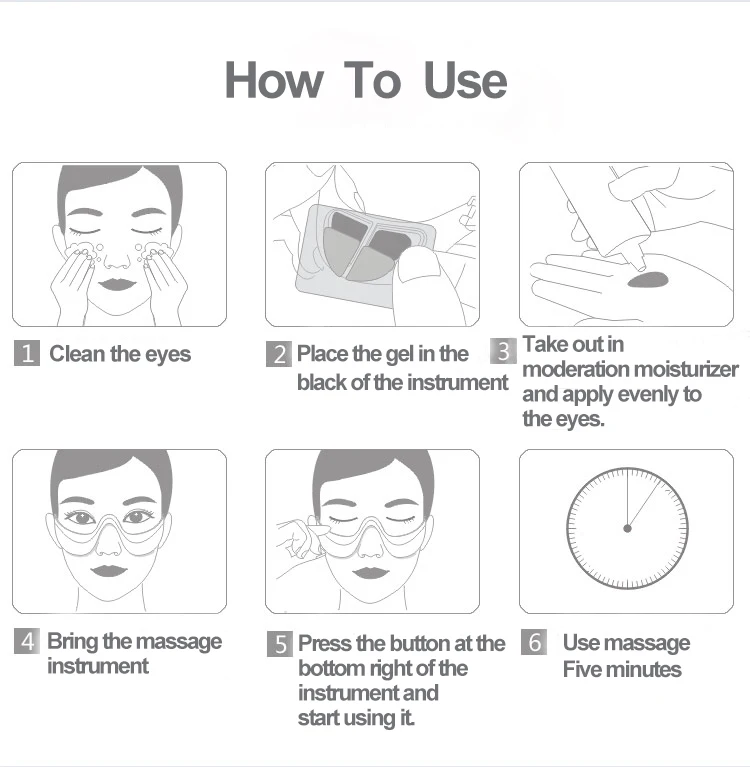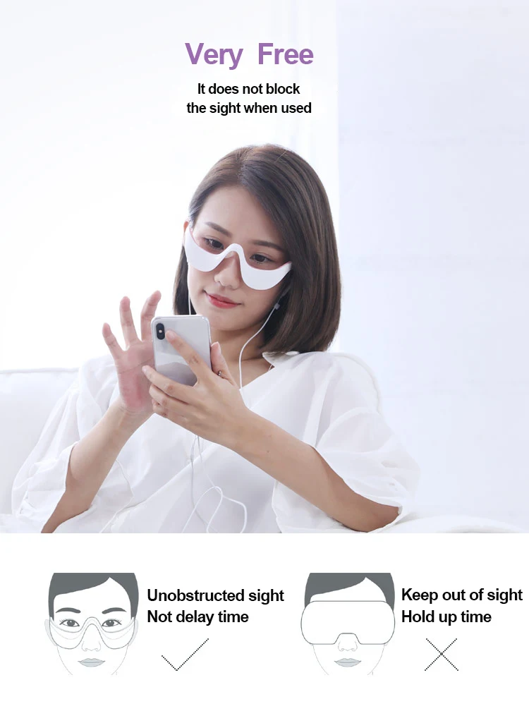 1. Носимая конструкция проста и удобна без ручной работы. 2: продукт разработан, чтобы избежать засорения зрения. Вы можете смотреть компьютер, играть с мобильным телефоном и работать по дому, не отнимая времени. 3: Время использования 5 минут. Через 5 минут машина автоматически отключится. Операция проста. 4. Продукт разработан с силикагелем для контакта с глазами, который более соответствует контуру глаз и более гибкий и удобный. 5. Собственный вес продукта позволяет проводящей клейкой части, которая генерирует микро электрический ток, чтобы непосредственно повлиять на лицо глаз. Простой и простой в использовании светильник.