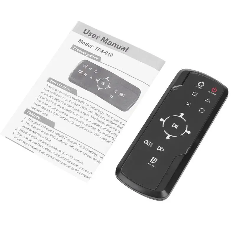 3. После того, как пульт дистанционного управления подключен к хосту для PS4, он может выполнять DVD пульт дистанционного управления или выбор меню и другие функции. Примечание: когда пульт дистанционного управления воспроизводит Blu-Ray DVD, если он не может управлять воспроизведением DVD, это означает, что ручка для PS4 является основным контроллером, необходимо нажать кнопку «HOME» пульта дистанционного управления, переключиться на пульт дистанционного управления в качестве основного контроллера, а затем нажать « Домой», чтобы вернуться к воспроизведению, затем он может использовать функциональную кнопку на пульте дистанционного управления для управления воспроизведением Blu-Ray DVD.