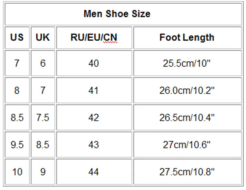 Размер мужской обуви США Великобритания RU/EU/CN Длина стопы 7 6 40 25,5 см/10" 8 7 41 26,0 см/10,2" 8,5 7,5 42 26,5 см/10,4" 9,5 8,5 43 27 см/10,6" 10 9 44 27,5 см/10,8"